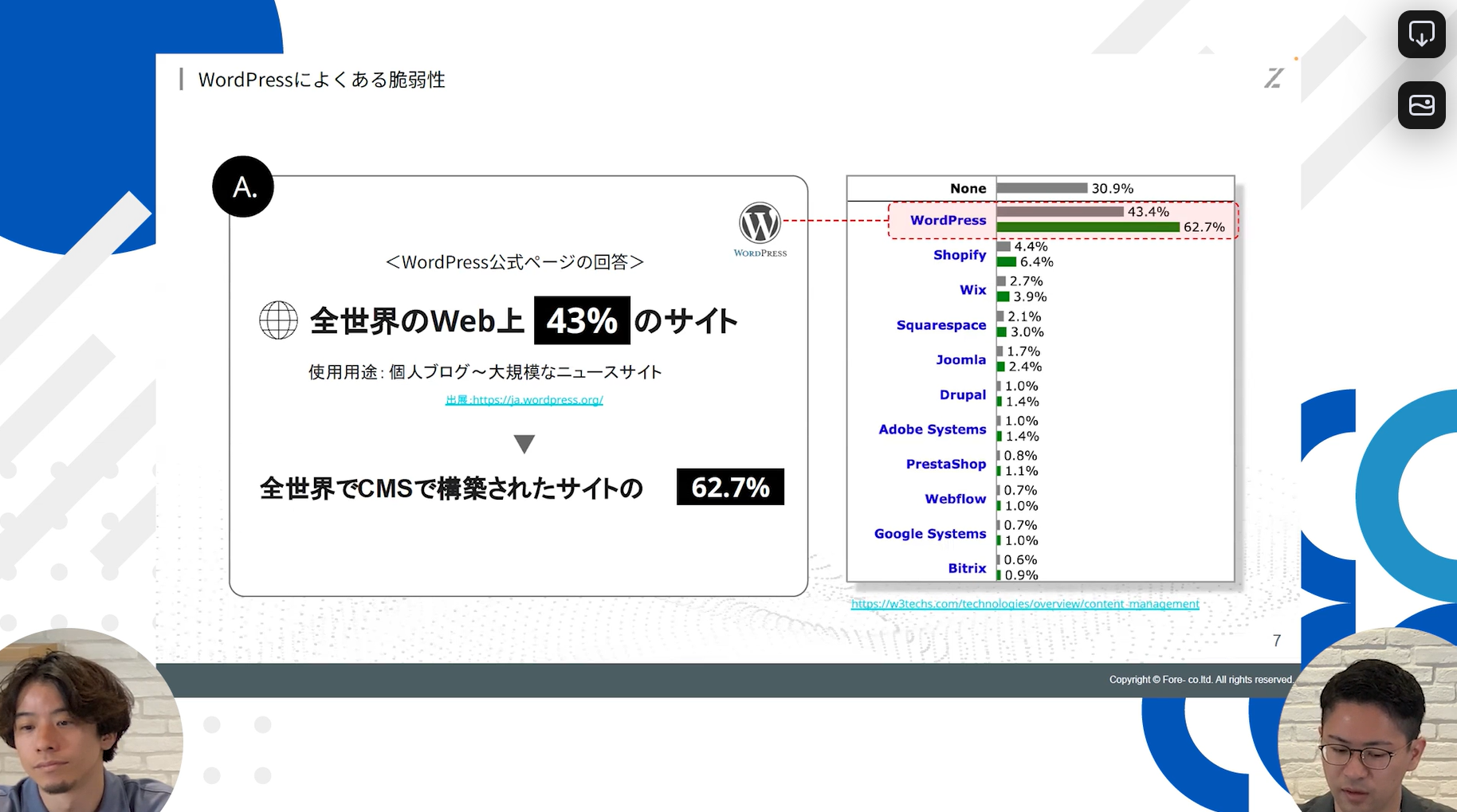 本インタビューの前半では、グローバルでのWordPressの利用率およびWordPressを使う上での注意事項について、Fore-Zが実施する脆弱性診断業務での経験を交えて、ご紹介しました。