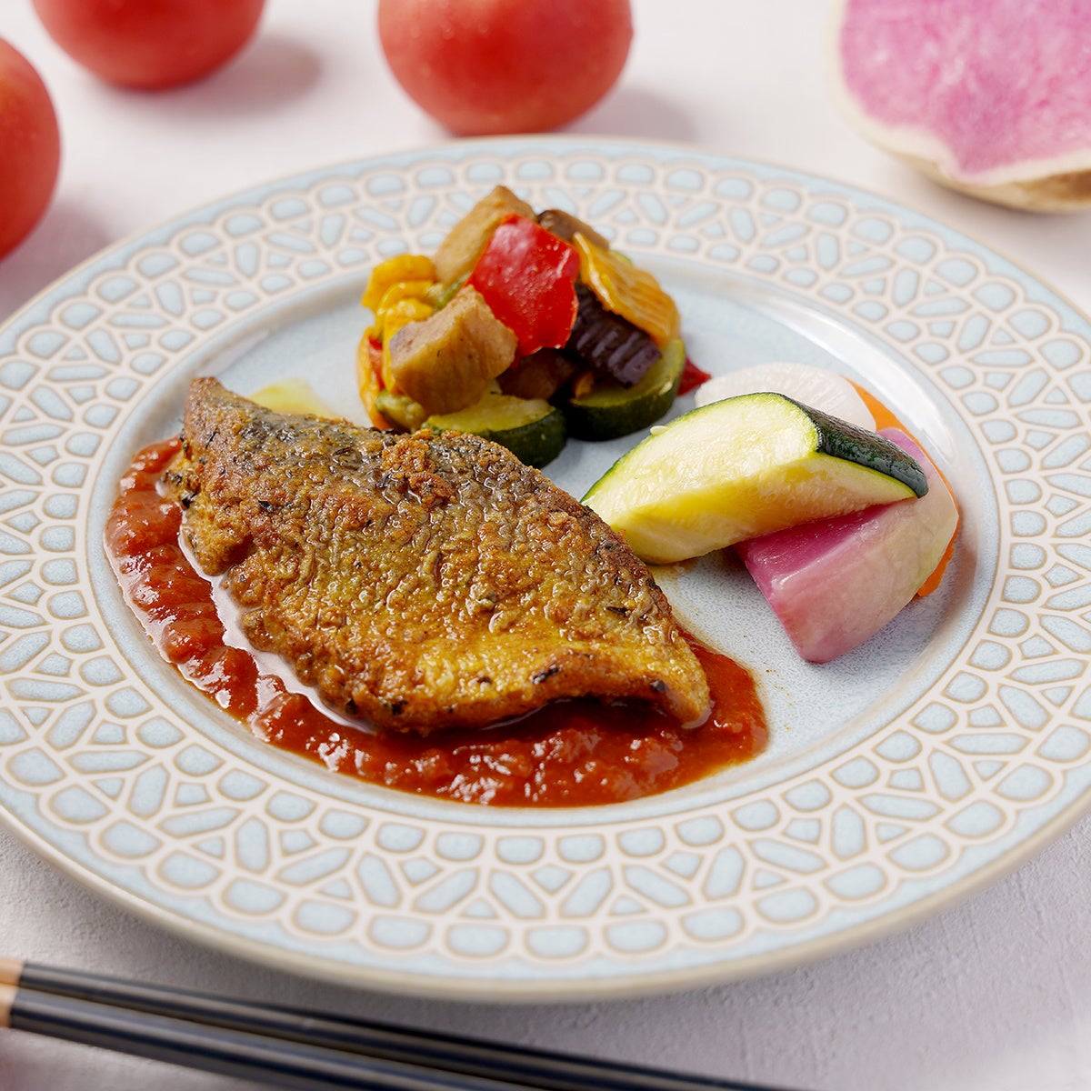白身魚のハーブカレー焼き アジアントマトソース