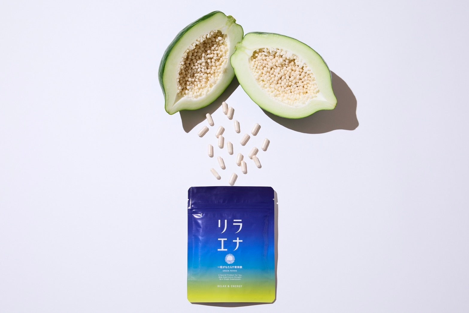 酵素の王様「青パパイア」を丸ごと(実も皮も種もすべて)3年以上発酵・熟成したカリカセラピをカプセルの中に閉じ込めて腸まで届ける。それが「リラエナ」です。一粒がもたらす新体験を体感ください。