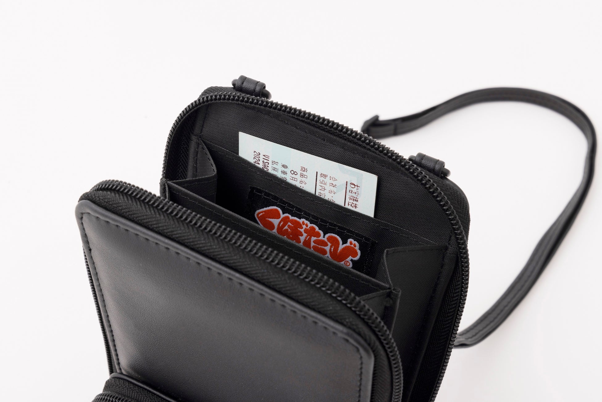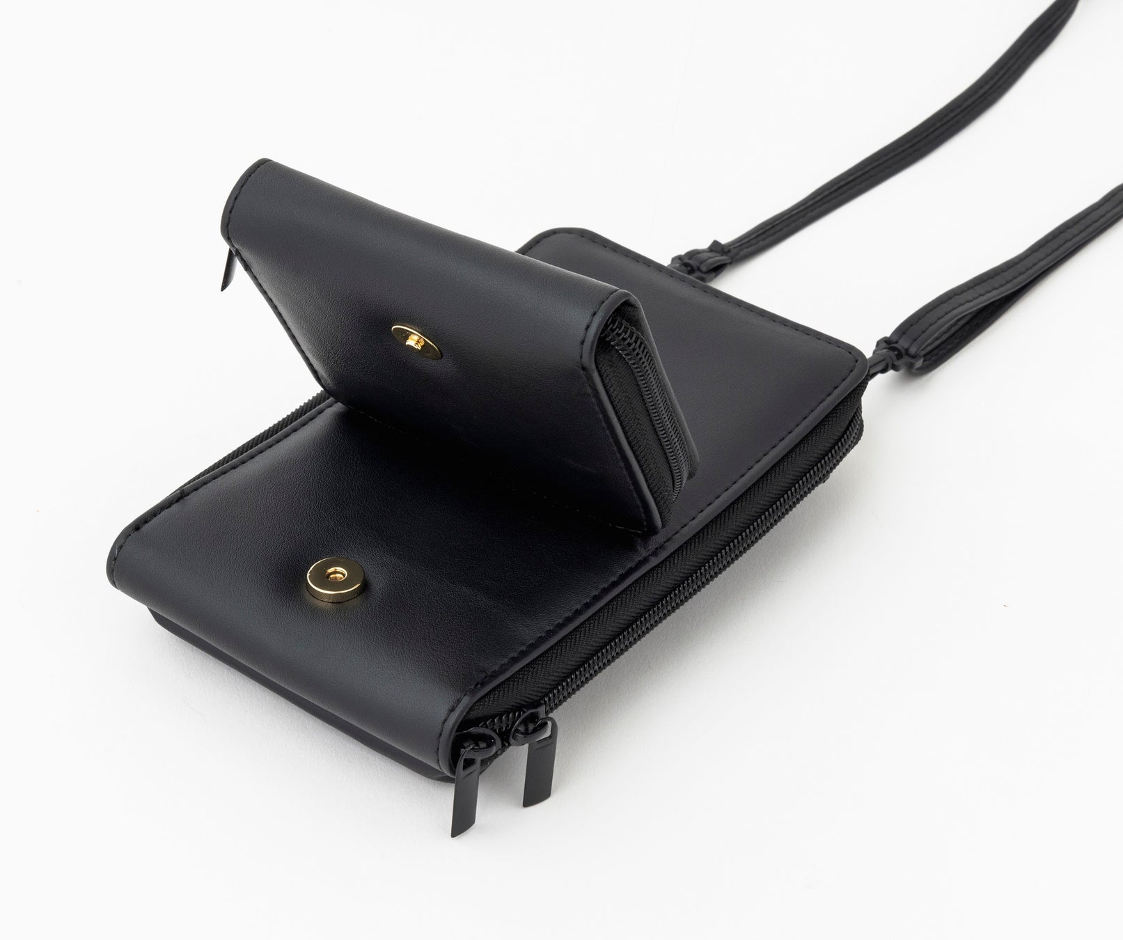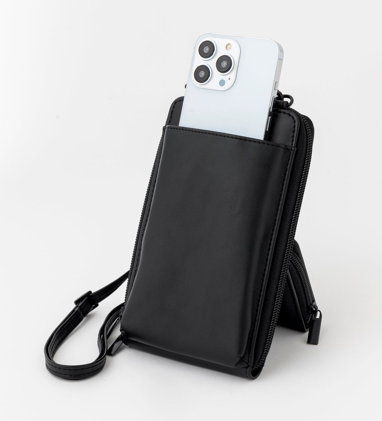旅行や街歩きの際に便利なのは、両手が空くショルダーバッグ。この商品は、三脚・ICカードケース・お財布・バッグという4つの機能がついており、荷物をひとつにまとめて持ち歩くことが可能です。さらに、黒の合皮素材を使用することで、どんな服装にもなじむスタイリッシュなデザインにしました。