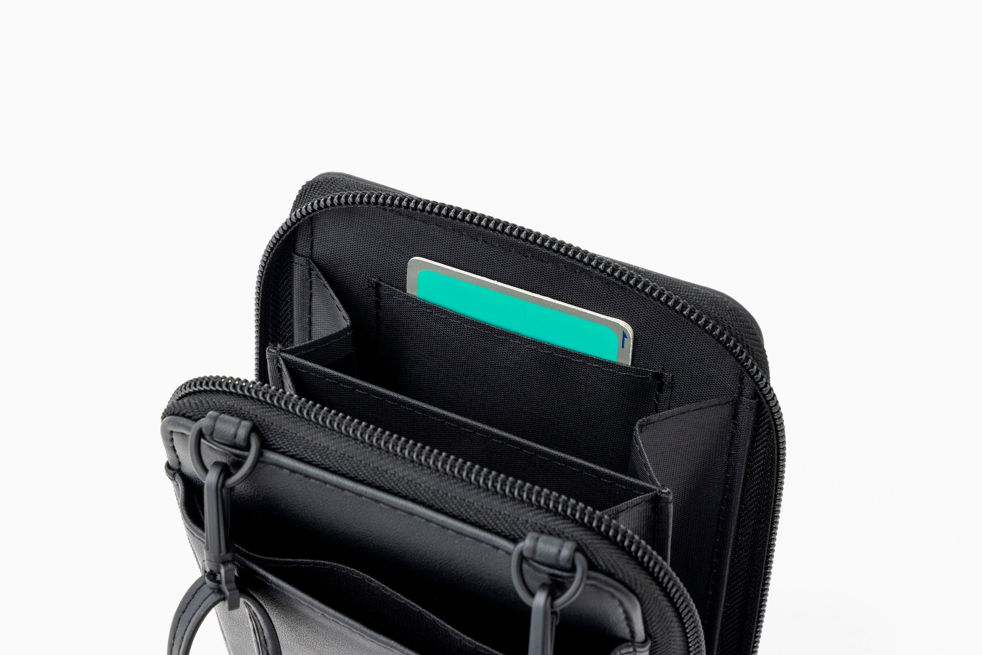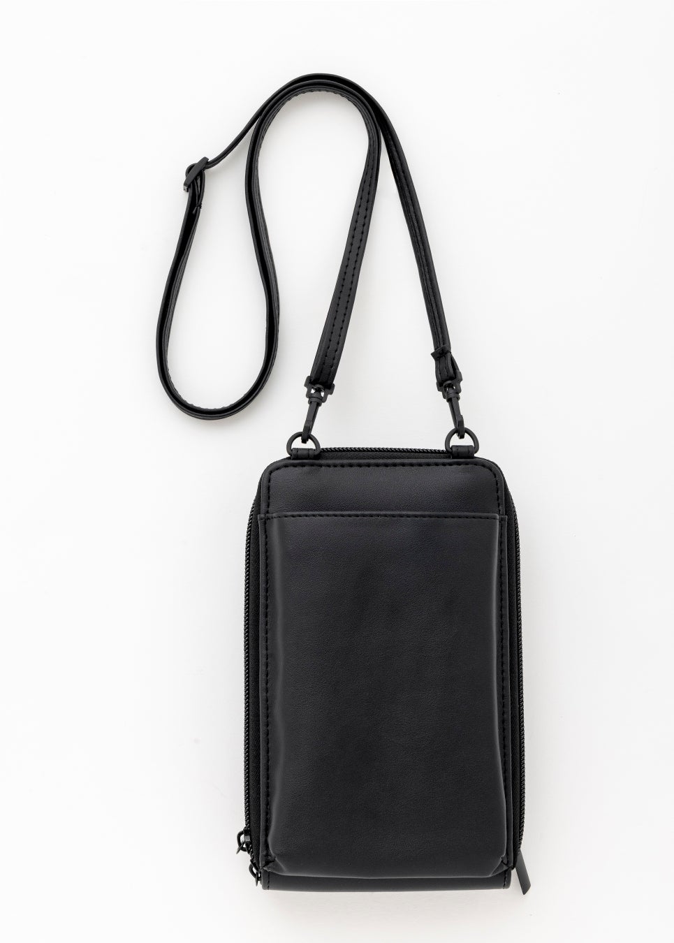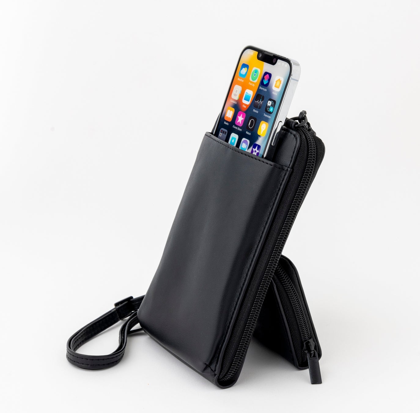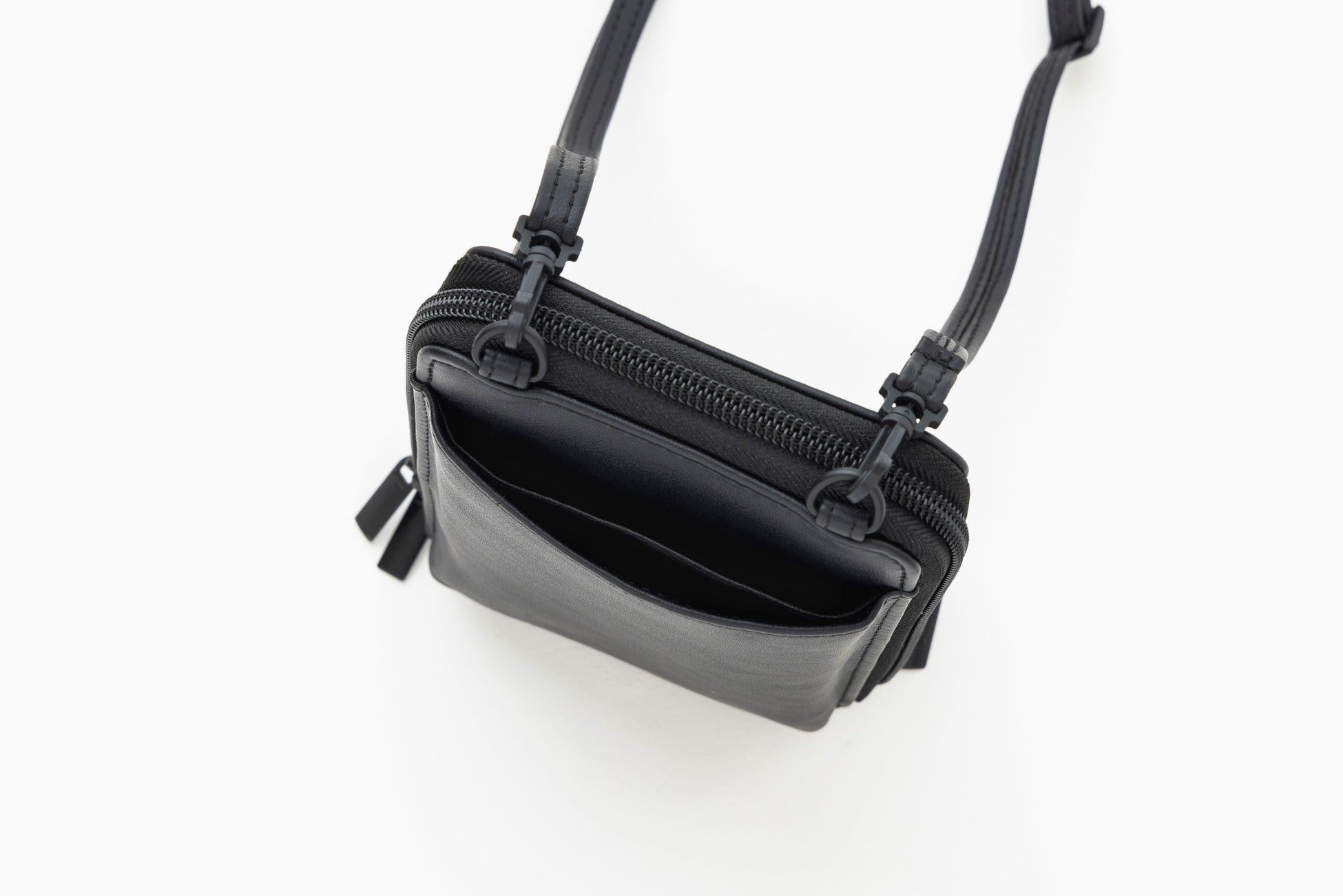 旅行や街歩きの際に便利なのは、両手が空くショルダーバッグ。この商品は、三脚・ICカードケース・お財布・バッグという4つの機能がついており、荷物をひとつにまとめて持ち歩くことが可能です。さらに、黒の合皮素材を使用することで、どんな服装にもなじむスタイリッシュなデザインにしました。