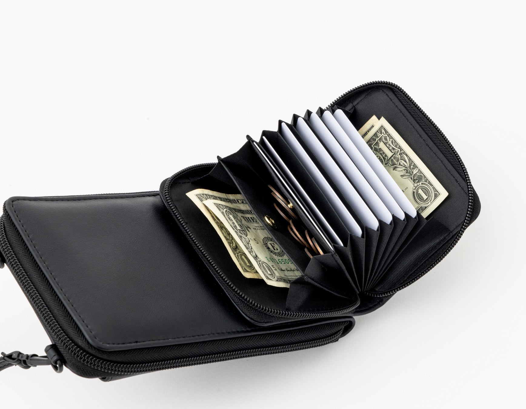 小型ポーチのジッパーを開けると、お財布として機能するスペースが現れます。お札を折らずに収納でき、コインやカード(カードポケットは6つ)も収納可能です。コインを多めに収納すると、重心が下になり、バッグの自立性がさらに向上します。
