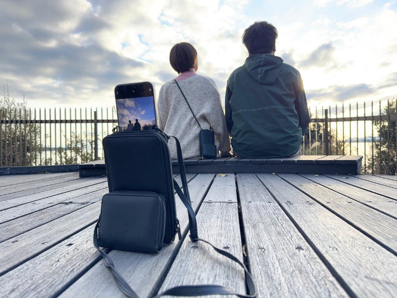 本バッグは、自立する設計になっており、スマートフォンの三脚としての機能がついております。スマートフォンをバッグのポケットに入れて、タイマー機能を使えば、カメラでの撮影がイン・アウトのどちらでも可能。三脚を持たずとも、三脚で撮影したような写真を撮ることができます。