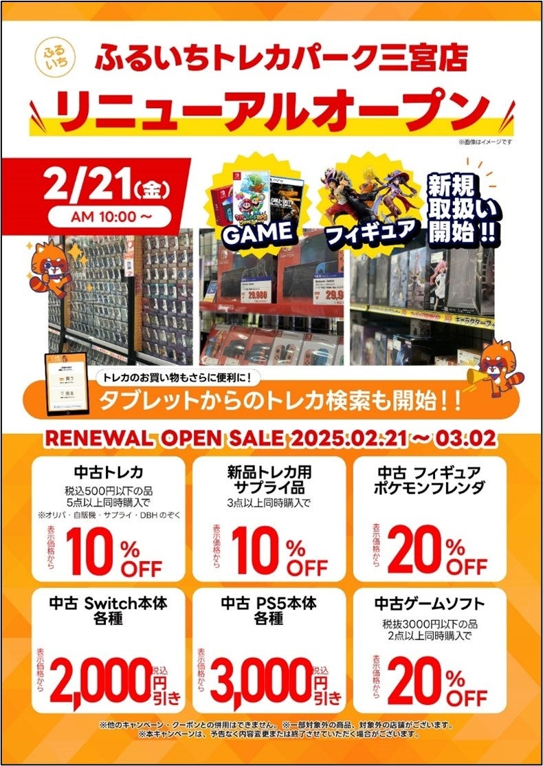 2025年2月21日(金)~3月2日(日)の期間中、リニューアルオープンを記念して、人気商品や魅力的なセールキャンペーンを多数ご用意しております。ぜひこの機会に、ふるいちトレカパーク三宮店にお越しください。