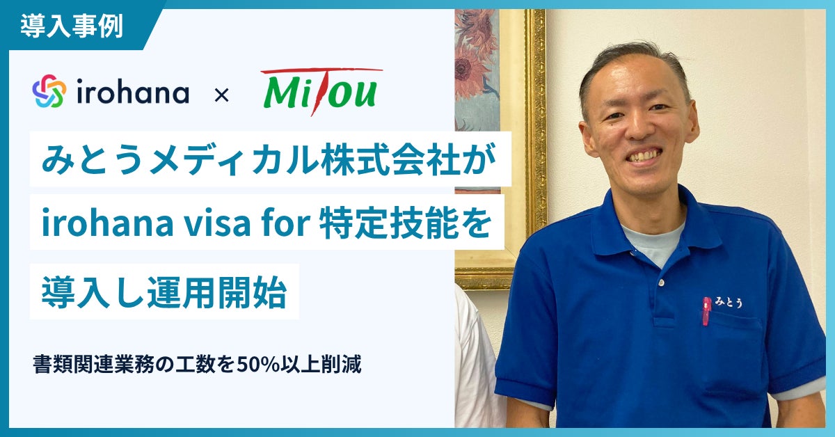 いろはな株式会社(本社:東京都新宿区、代表取締役:澤和寛昌、以下「いろはな」)が開発・提供する登録支援機関向け書類申請DXシステム「irohana visa for 特定技能」が、みとうメディカル株式会社(本社:大阪府大阪市、代表者:倉岡七恵、以下「みとうメディカル」)に導入され、運用を開始したことをお知らせいたします。