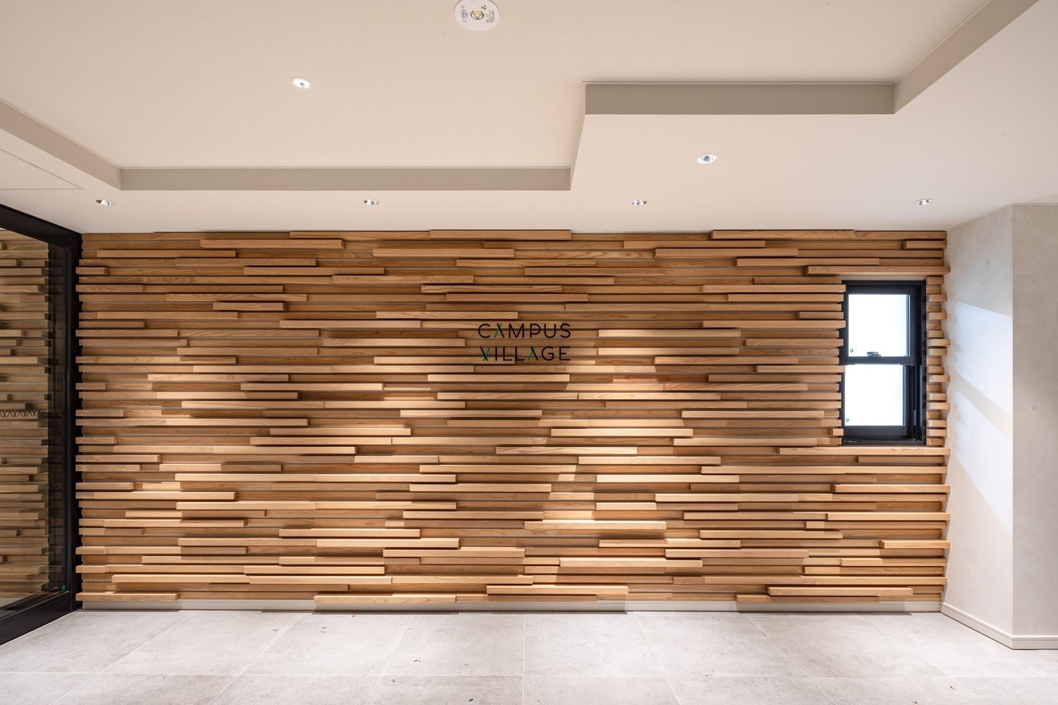 本物件は、外観や内観に木調を多く取り入れぬくもりのあるデザインになっています。エントランスや、共有スペースへの入り口付近には、壁面に天然木をランダムに張り付けたデザインを施し、リラックス効果も期待される「木」を身近で感じることでより落ち着いた共有スペースとなっています。また、学生が使用できるキッチンと一体型のダイニングテーブルや、ソファベンチなどもデザインを木調に統一することで内観をよりあたたかみのある柔らかい印象となるようなインテリアとしました。