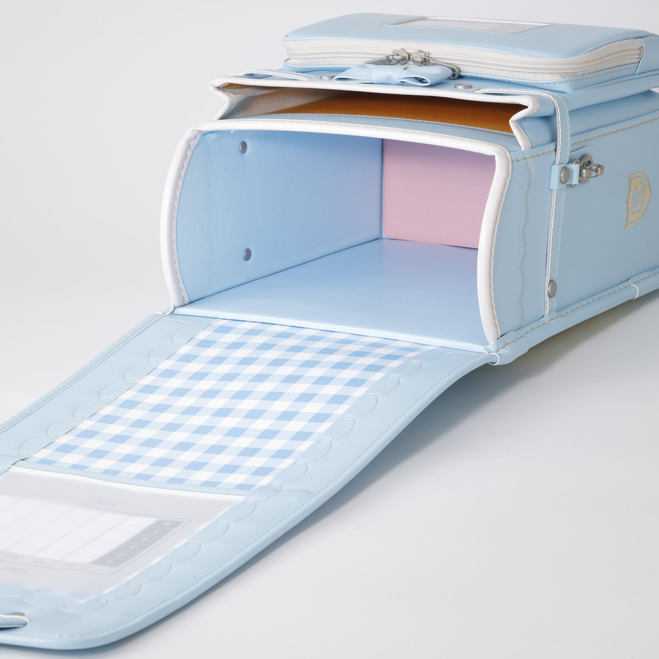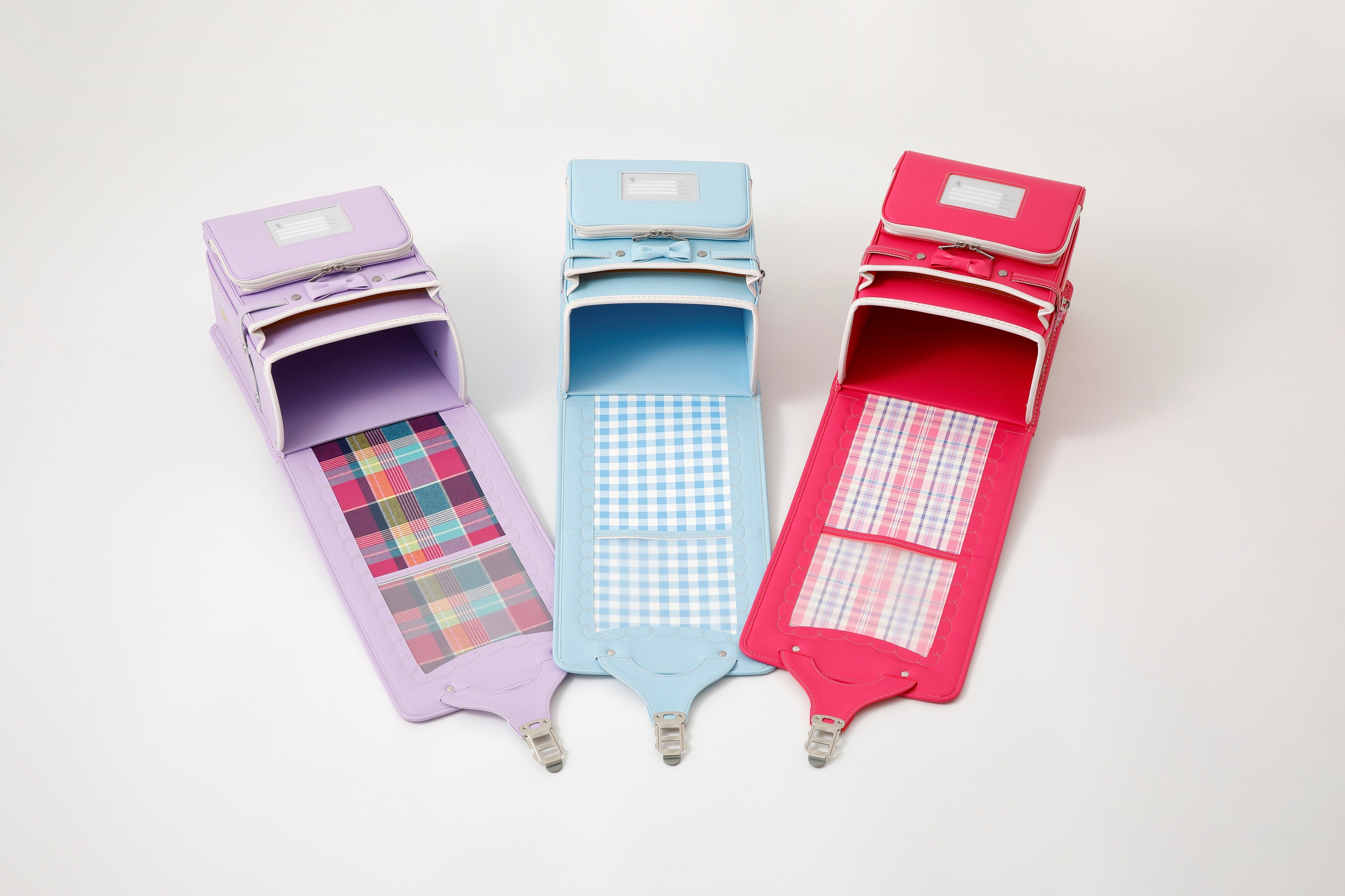 かぶせ裏に本体カラーに合わせたチェック柄のプリントを施し、前ポケット上部に立体的なリボンを取り付けた、キュートなデザインです。