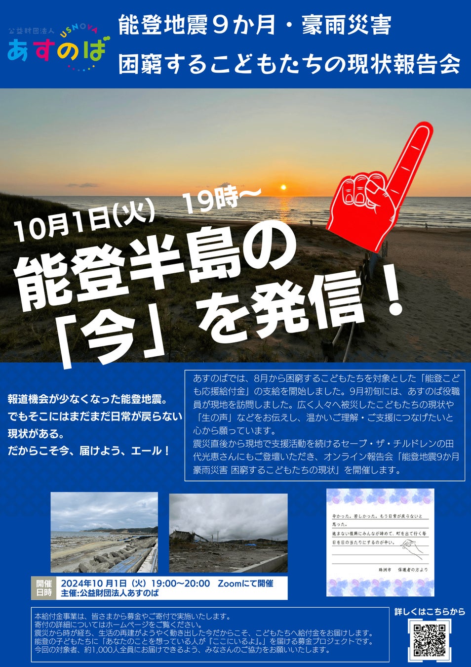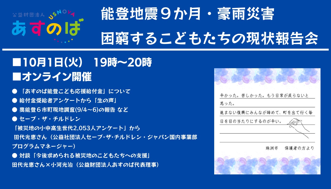 公益財団法人あすのばでは、10月1日(火)に『能登地震9か月 豪雨災害 困窮するこどもたちの現状』と題して、オンラインイベントを開催いたします。