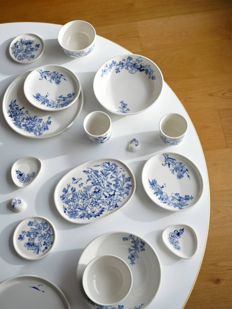 「Haru」コレクションの食器は、ムーミン アラビアのデザインチームが、トーベ・ヤンソンのリース(花輪)のモチーフをアレンジして組み合わせた、美しいインクブルーのイラストで飾られています。