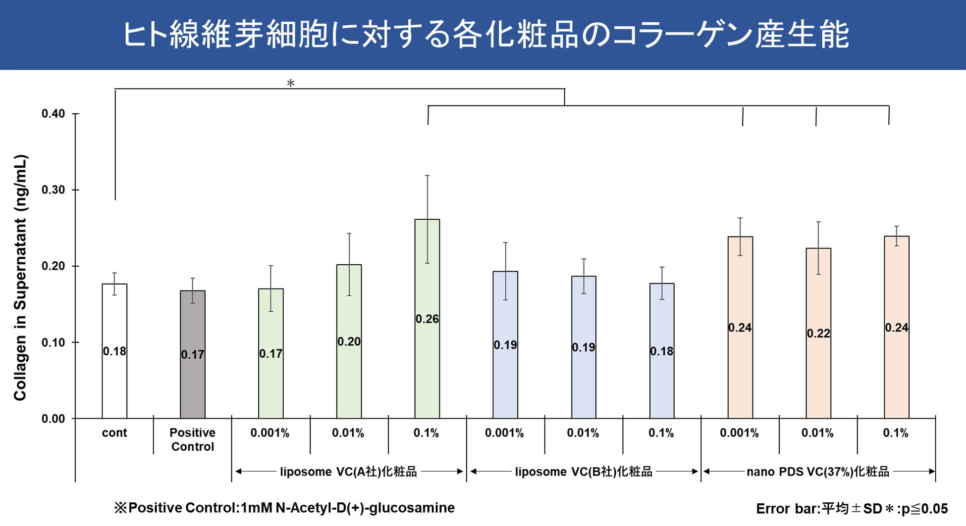 また、nanoPDS VC(37%)美容液は、リポソームVC化粧品と比較して同等の細胞活性を有しながらも、10~20倍という極めて高い皮膚浸透性を有することが確認されました。