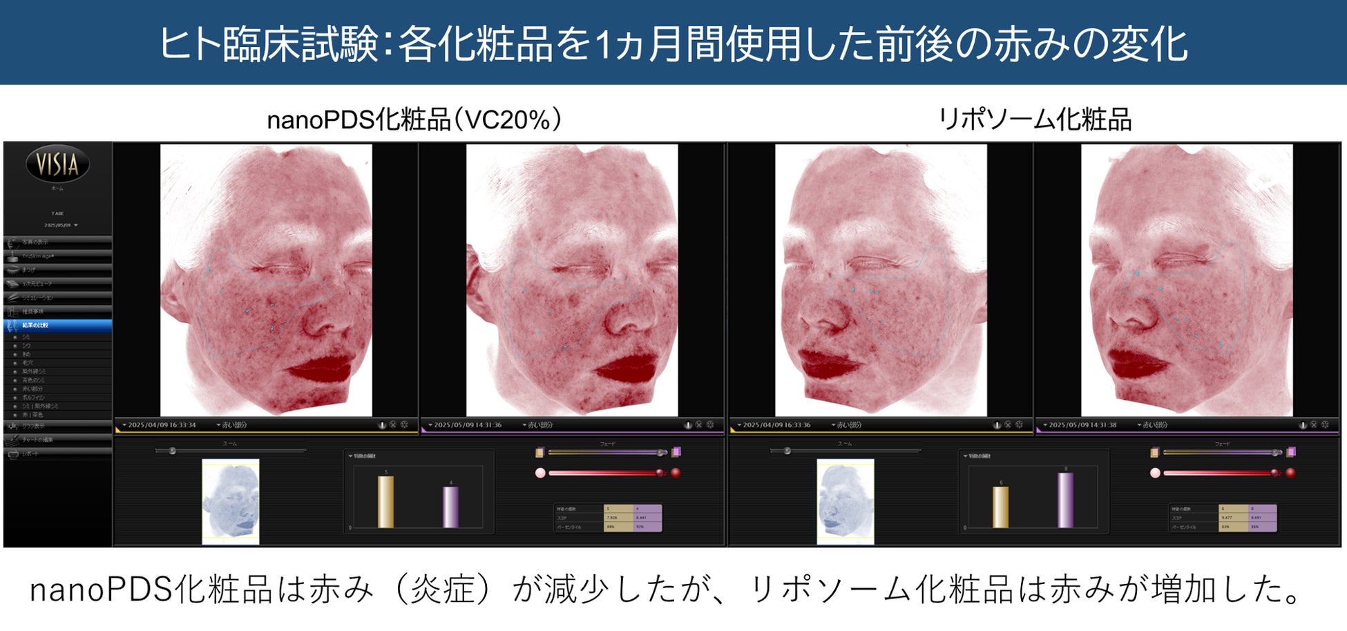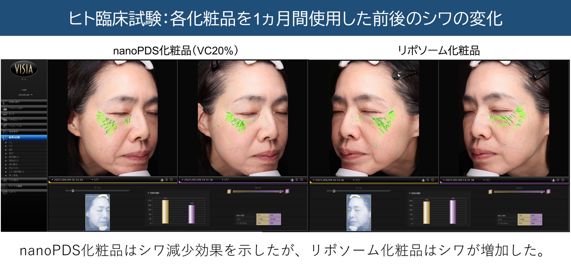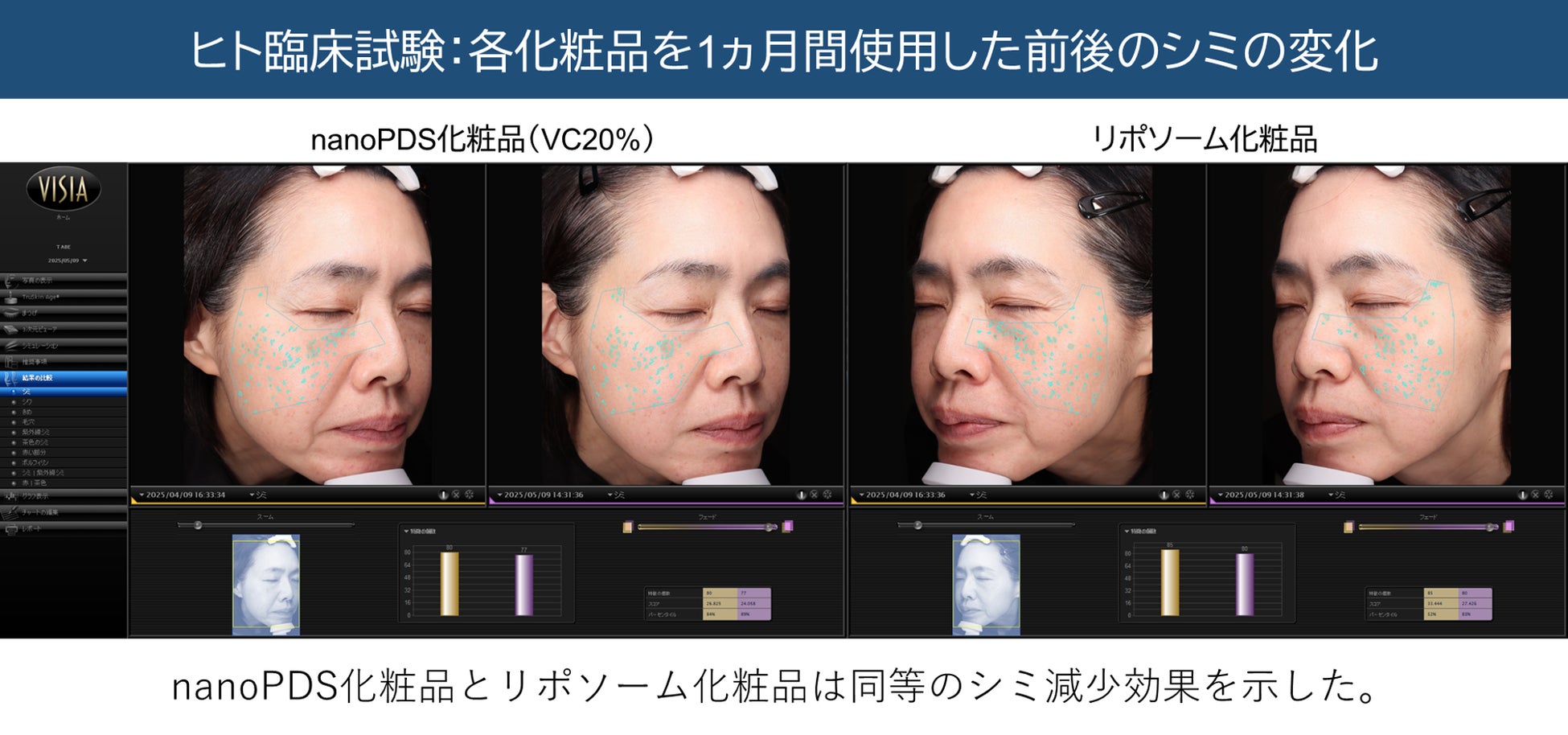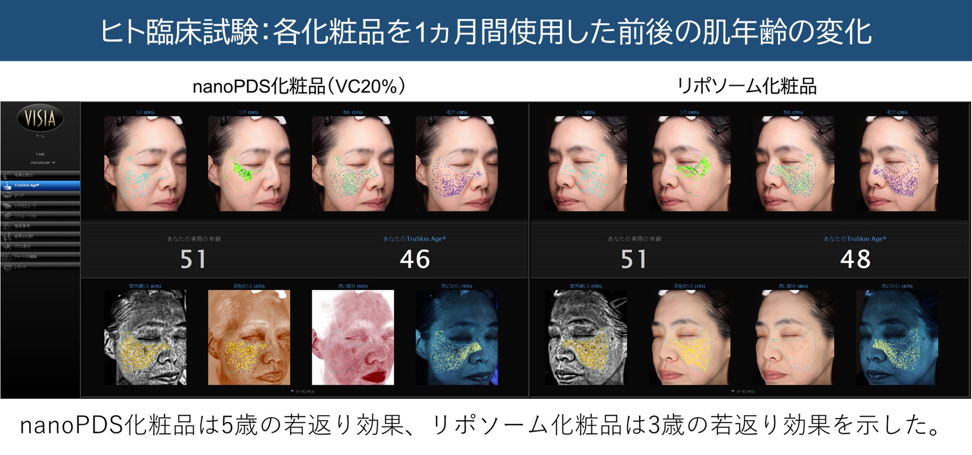 さらにヒト臨床試験では、nanoPDS VC(20%)クリームの使用により、シミ・シワ・赤みの減少、および肌年齢の若返り効果が確認されました。なお、nanoPDS VC(37%)美容液についても昨年、ヒト試験を実施し、抗加齢医学会にて毛穴やシワの減少効果や肌年齢の若返り効果を口頭発表しており、さらなる知見の蓄積もおこなっております。