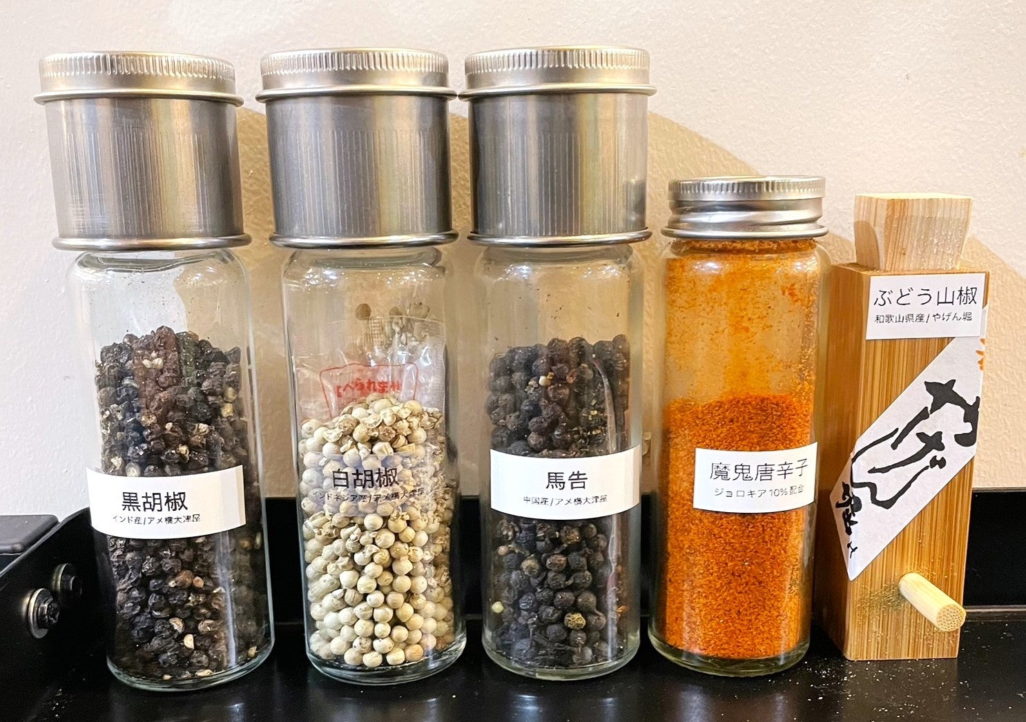 アメ横の大津屋でセレクトされたホールの黒胡椒です。香りが良く輪郭がハッキリ出ます。大津屋はカレーの香辛料として有名かつ人気店なので新鮮なスパイスが通年で購入可能な為、フレッシュなスパイスです。鯛白湯に強めに使用していただくと味変で味が締まります。