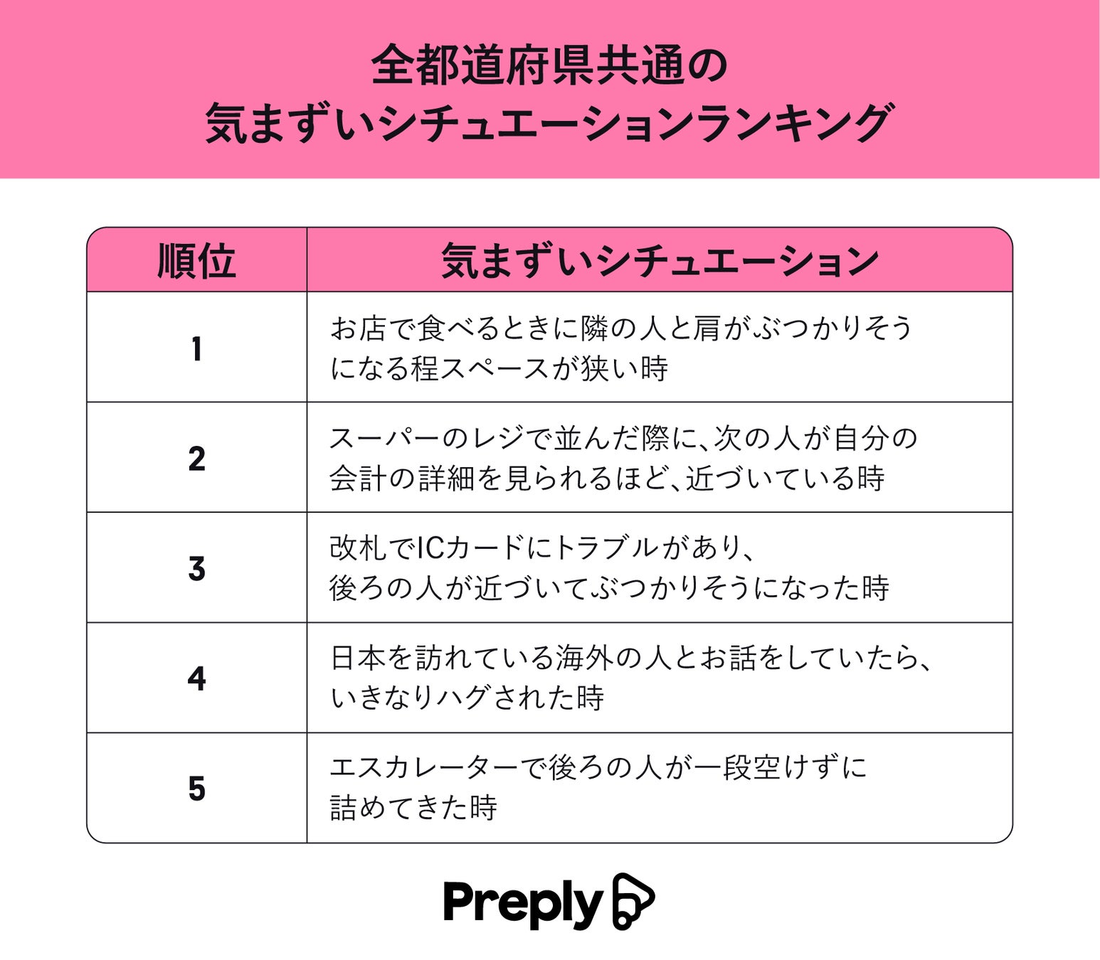 パーソナルスペースに関する調査の中で、全都道府県共通の「気まずいと感じるシチュエーション」についても明らかになりました。ランキングTop5は以下の通りです。