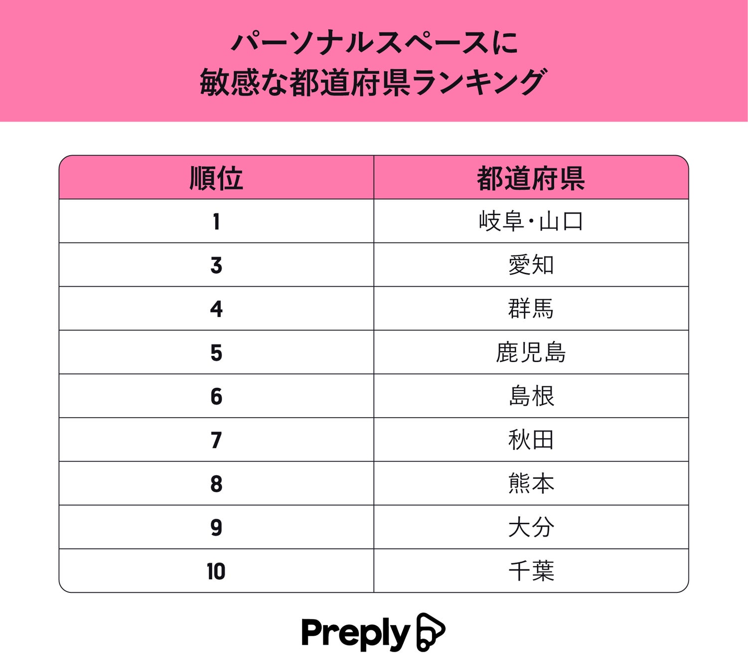 都道府県別にパーソナルスペースに関する考え方を調査したところ、パーソナルスペースに敏感な都道府県のランキングは以下のようになりました。