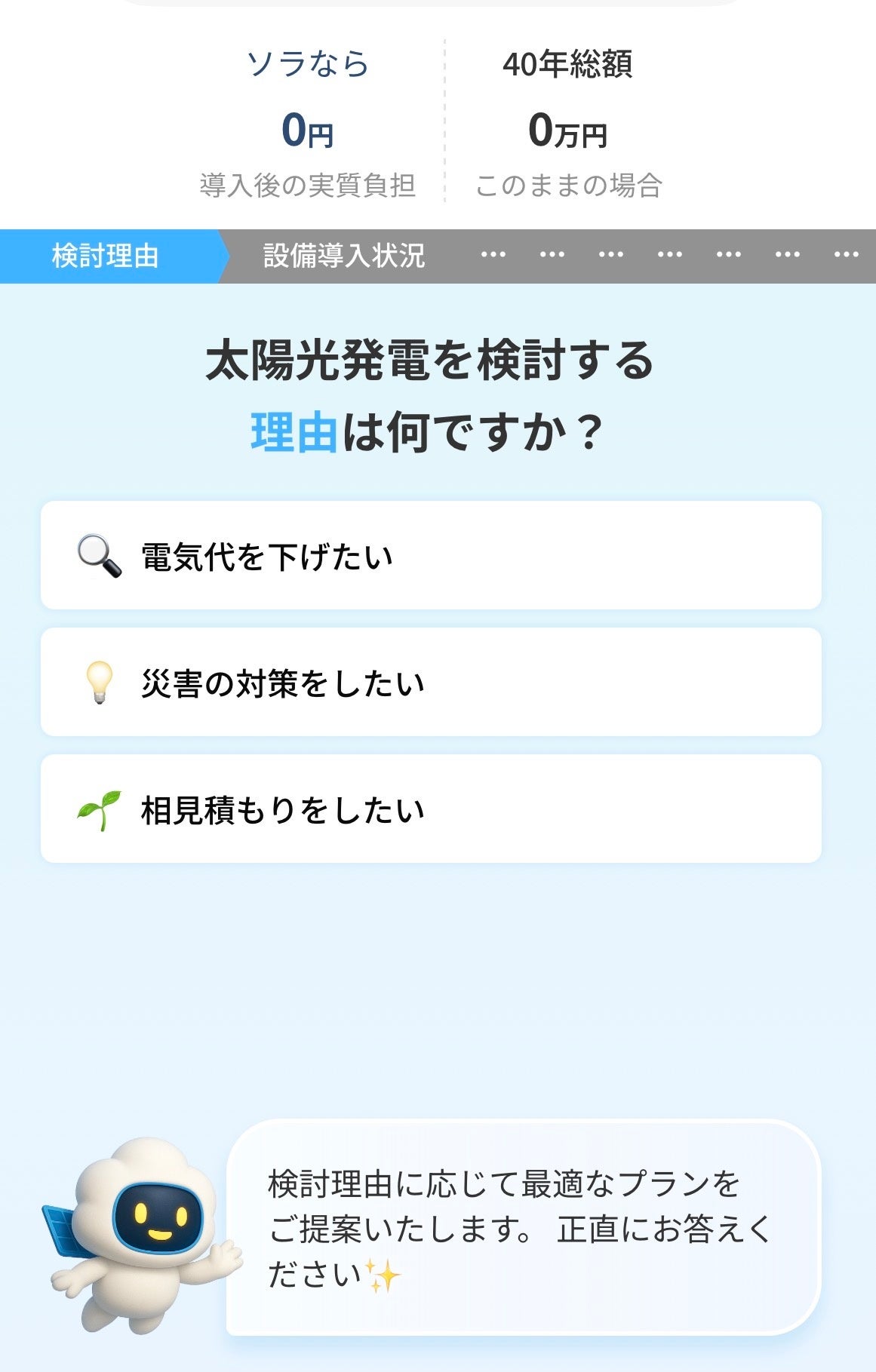 無料診断サイトから6つの質問に答えるだけで、最短30秒で現在の電気代に基づいた導入効果をスピーディーに算出できます。月々の電気代が分かる「検針表」や、平米数が分かる「家の図面」をご準備いただくと、スムーズにシミュレーションができます。