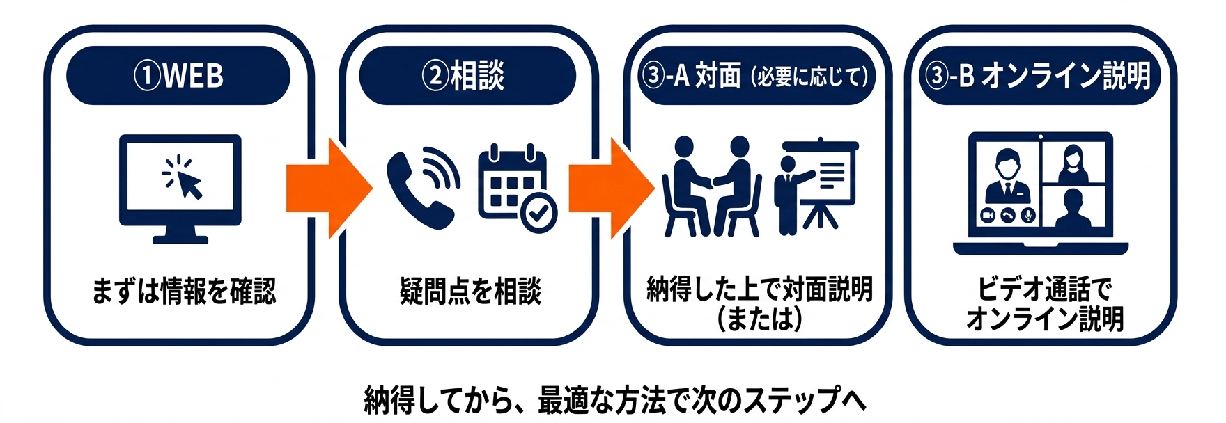 あらかじめ決められた手順を押し付けるのではなく、お客様の検討段階やご要望に応じて、必要なタイミングで対面での説明や具体的な提案を実施いたします。