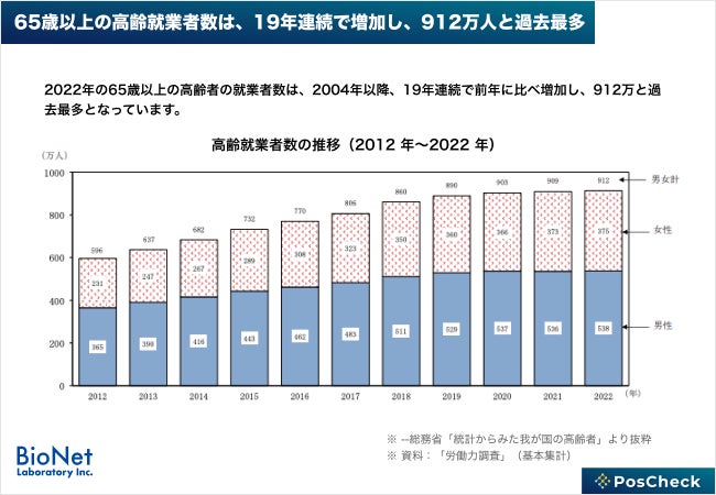 厚生労働省発表資料および総務省統計局提供のデータによると、65歳以上の高齢者の就業者数は、19年連続で増加し912万人と過去最多を記録し、就業者総数に占める高齢者の割合も13.6%と過去最高水準を記録しています。