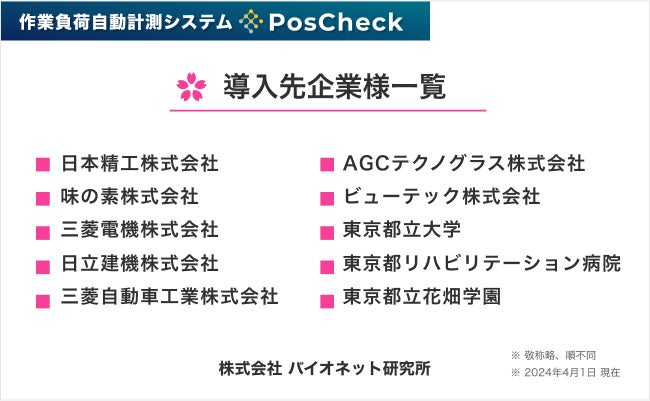 腰痛問題や安全衛生管理に関するバイオネット研究所の取り組みをご紹介します。 PosCheckはこれまで、大手建機メーカー様、大手上場企業様の工場や作業施設の他、病院、大学など、さまざまな場でご活用いただいて参りました。