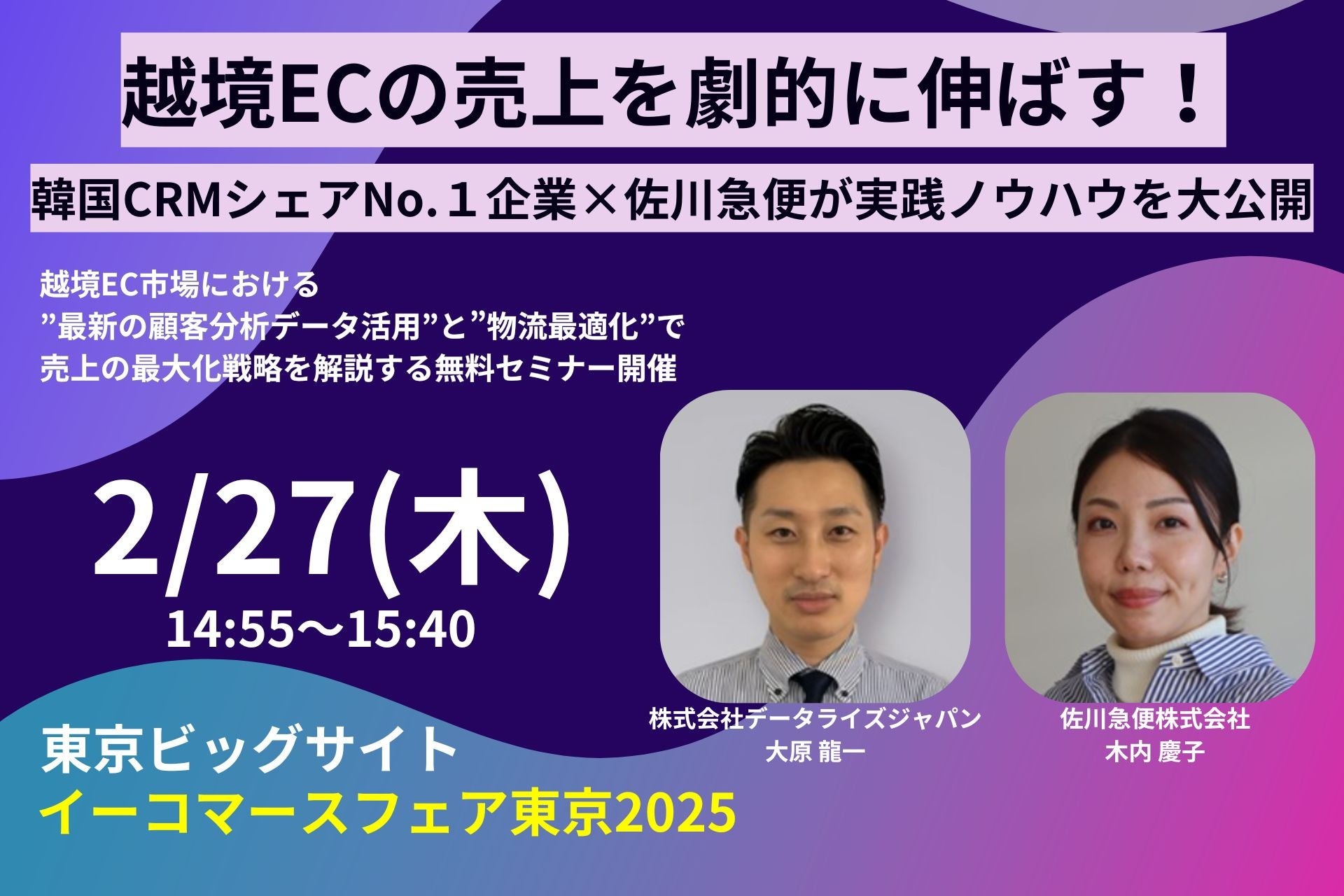 2025年2月27日(木)東京ビッグサイトで開催される「イーコマースフェア2025 」において、韓国でCRMマーケティングシェアNo.1を誇るデータライズジャパンと日本を代表する物流企業佐川急便が、越境EC市場における「顧客分析データ活用」と「物流最適化」を通じて売上最大化戦略を解説するセミナーを開催いたします。