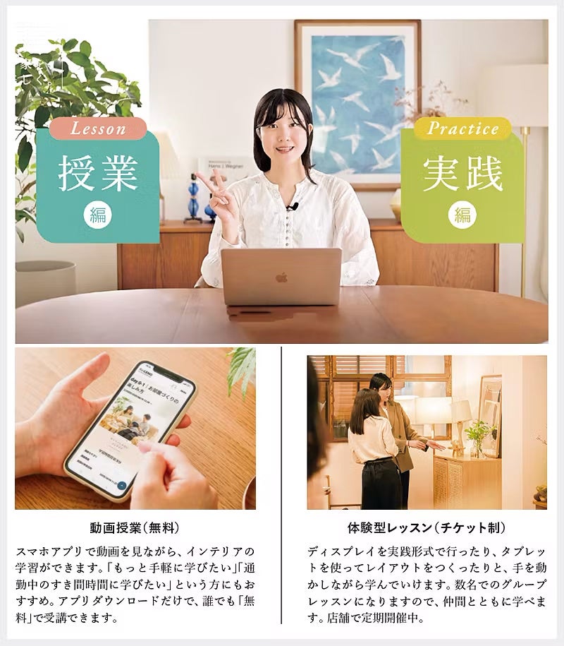著者であるインテリアブランドRe:CENO(リセノ)は、2026年1月に「インテリアの学校」を新たに開校予定です。この学校は、「オンライン動画」「店舗での体験型レッスン」で構成されており、その学習カリキュラムは今回発売する書籍と連動しています。