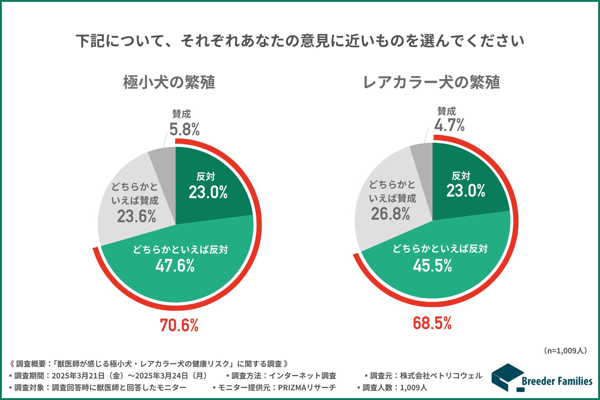 いずれも「反対」または「どちらかといえば反対」と回答した獣医師が約7割を占め、極小犬やレアカラー犬の繁殖に対する専門家の強い懸念が浮き彫りとなりました。