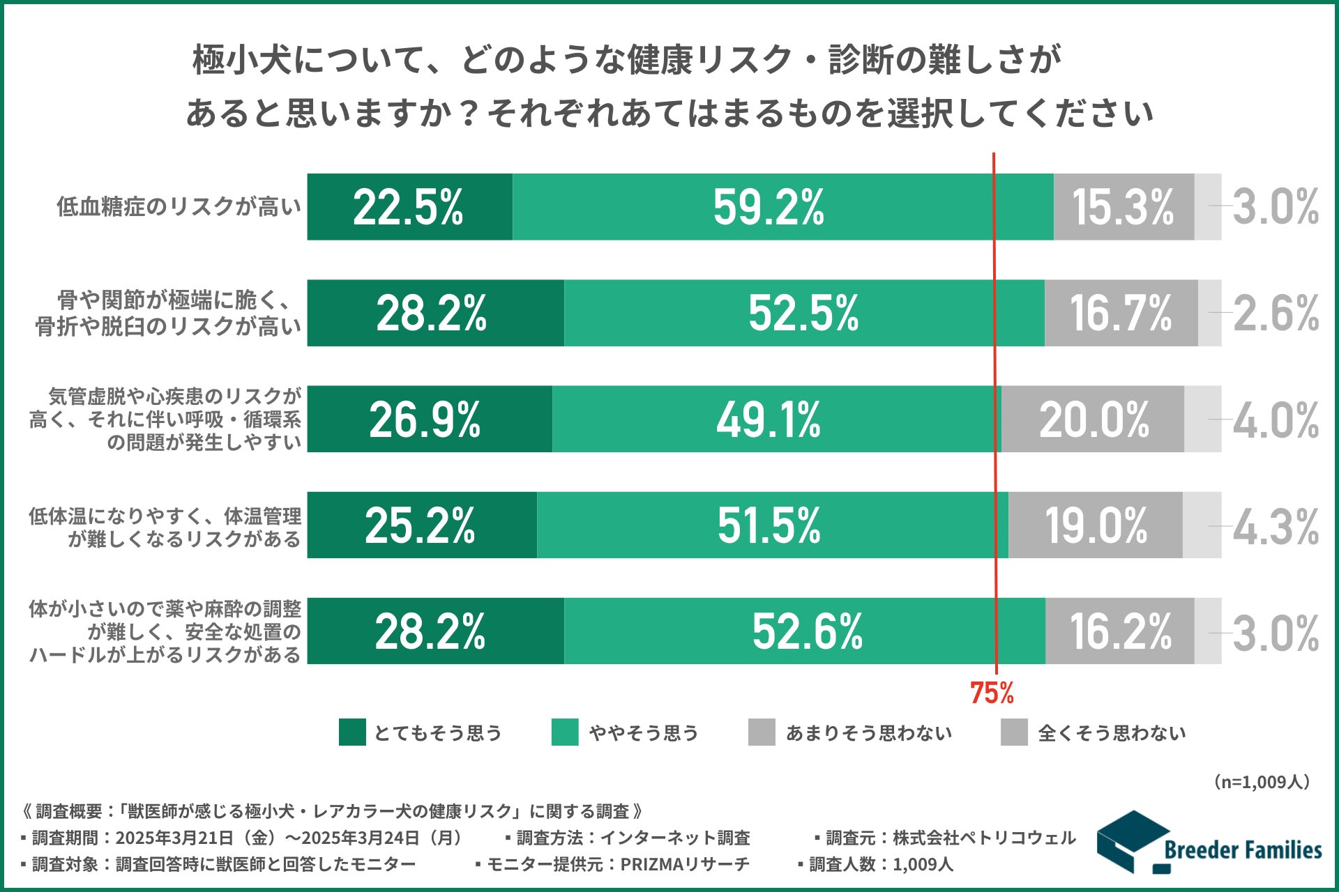 こうした状況を受けて、ワンちゃんを家族のように大切に育てる「優良ブリーダー」のみを厳選して紹介するマッチングサイト『Breeder Families』(https://breederfamilies.com/)を運営する株式会社ペトリコウェルは、「極小犬(極端に小型化された犬)やレアカラー犬の健康リスク」について、こういった問題と日々向き合っている獣医師を対象に調査を実施しました。