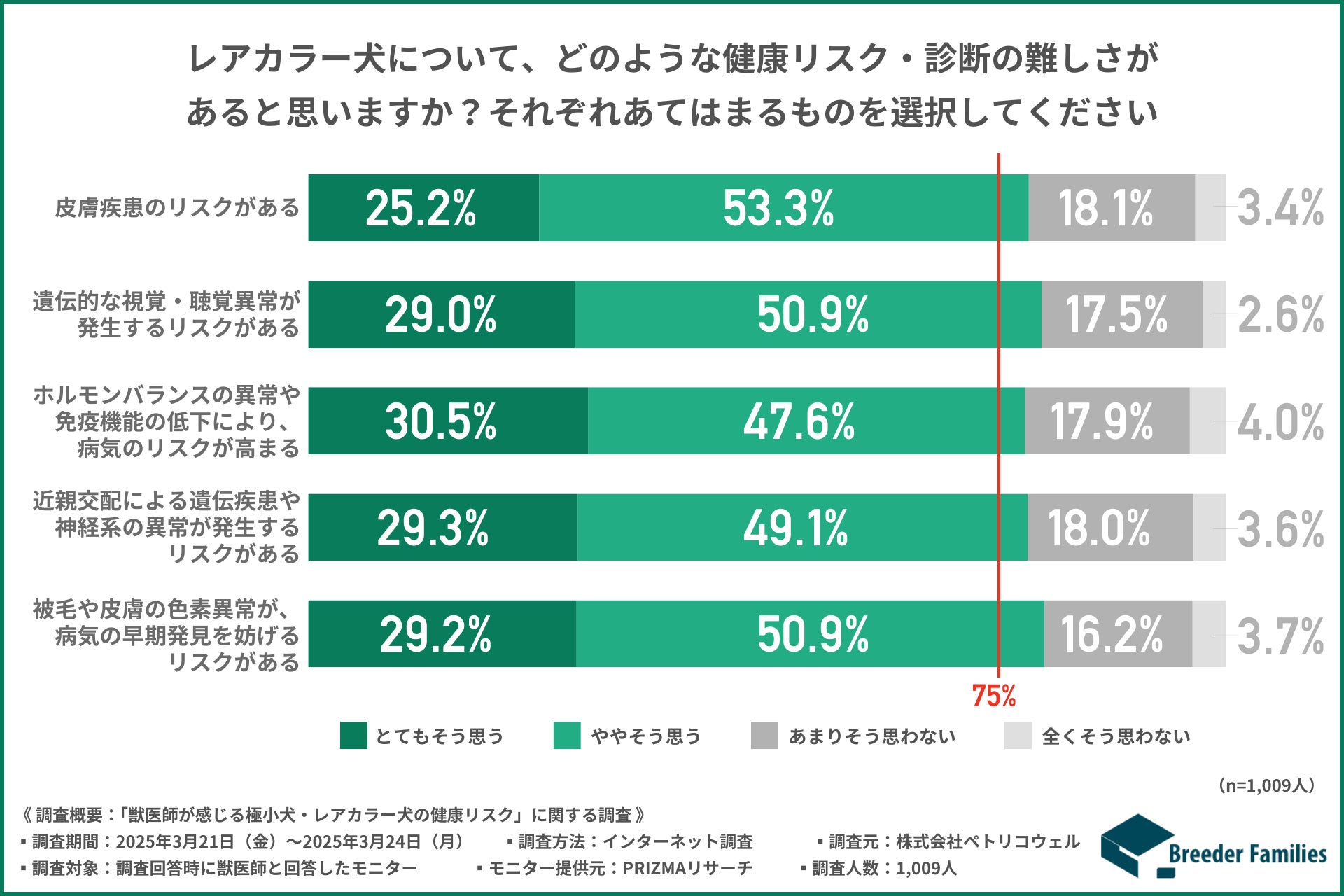 獣医師へのアンケートでは、「皮膚疾患が多い」「視覚・聴覚異常のリスク」「免疫やホルモンの異常」「近親交配による遺伝疾患」「色素異常による診断の難しさ」といった項目に対して、すべて75%以上の獣医師が「そう思う」と回答しています。