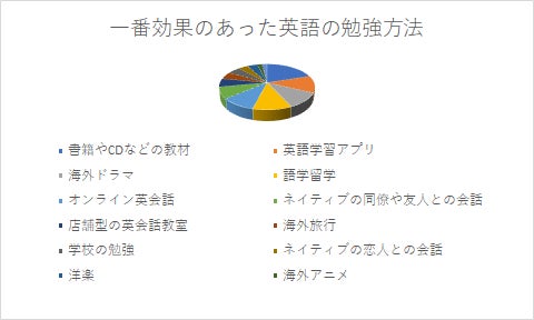以下、「海外ドラマ」「語学留学」「オンライン英会話」「ネイティブの同僚や友人との会話」「店舗型の英会話教室」「海外旅行」「学校の勉強」「ネイティブの恋人との会話」「洋楽」「海外アニメ」「洋画」と続きます。