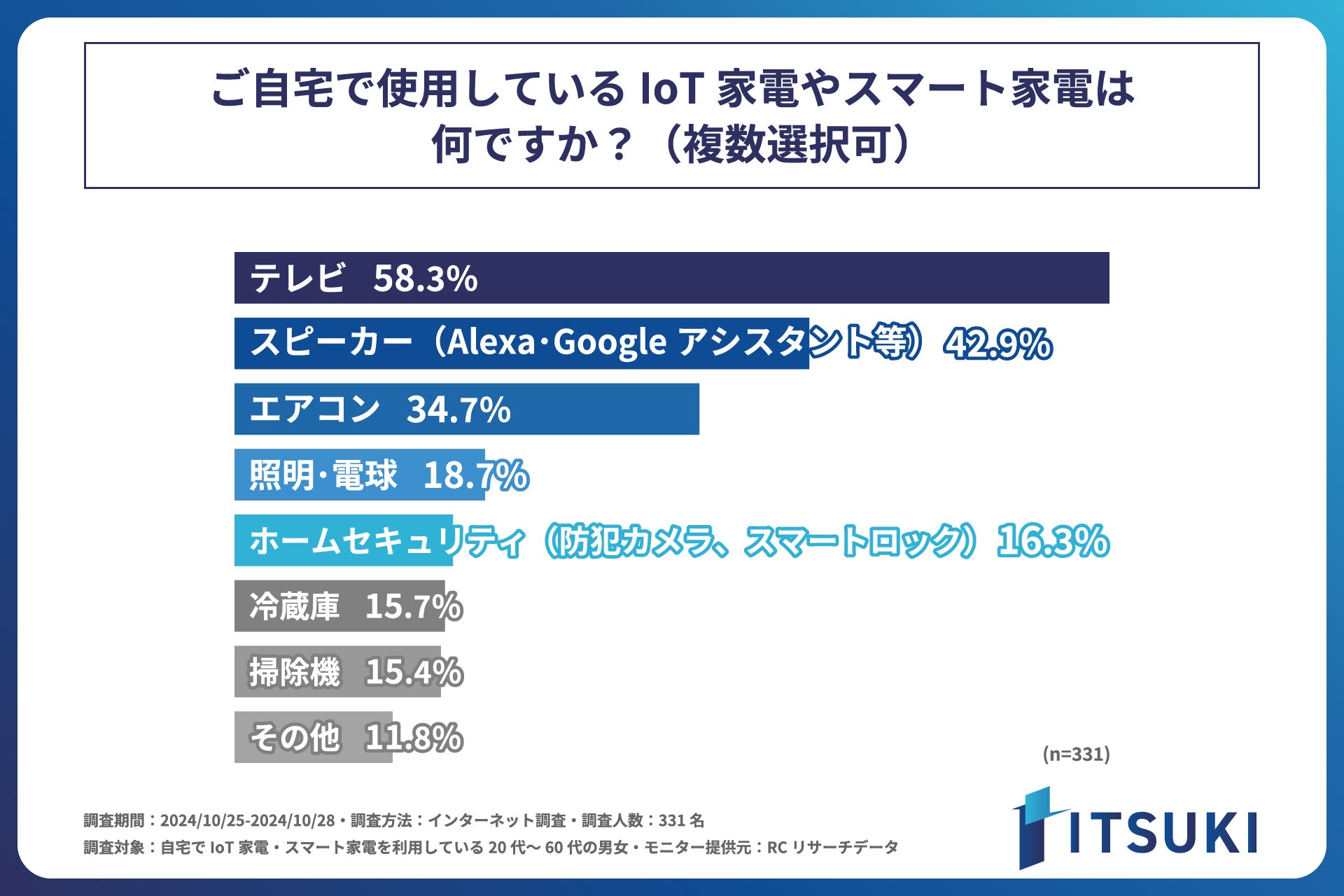 近年、スマート家電やIoT家電の普及により、私たちの生活はますます快適で効率的なものになっています。これらの家電には多様な製品があり、家庭で利用している方も多いでしょう。しかし、実際にはどのように利用されているのでしょうか。そこで「イツキ光」でインターネット回線事業を展開する株式会社ITSUKIは、自宅でIoT家電・スマート家電を利用している方(20代~60代)を対象に「IoT家電・スマート家電の利用実態」に関する調査を実施しました。