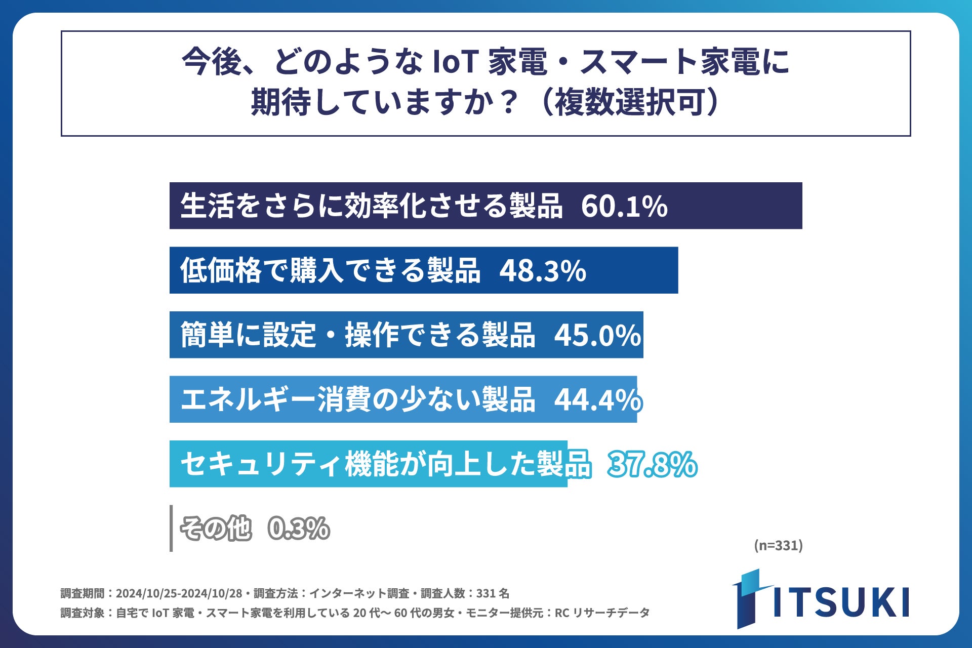 最後に「今後、IoT家電・スマート家電にどのような期待をしているか」を尋ねる設問への回答では、1位が「生活をさらに効率化させる製品」で60.1%、2位が「低価格で購入できる製品」で48.3%という結果になりました。「IoT家電・スマート家電を購入した理由」でも1位であった「生活の効率化」という回答がここでも首位となり、多くの方がIoT家電・スマート家電に期待しているものは「日常生活の効率化」であることが、この結果から改めて明らかになりました。