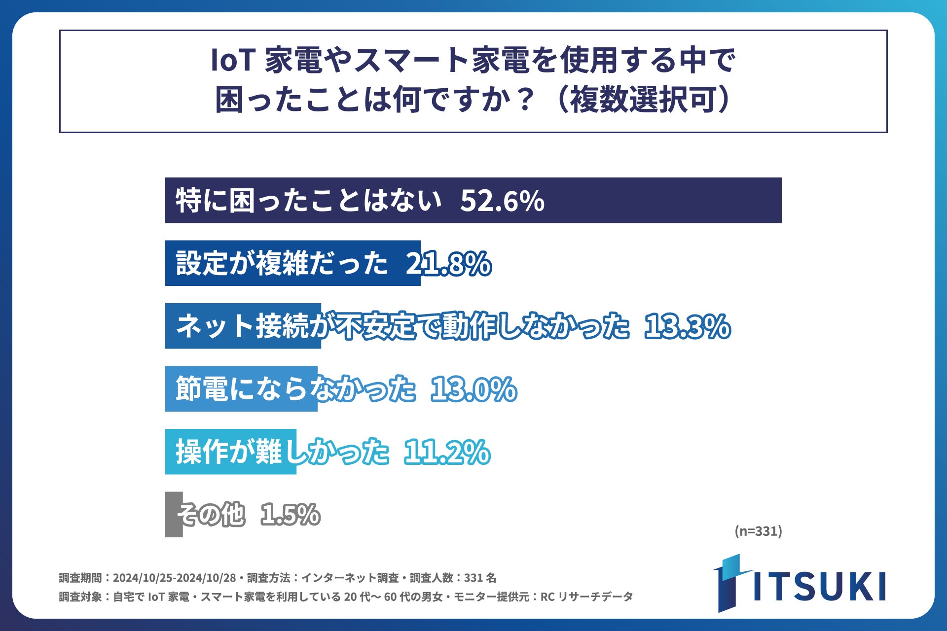 また、「IoT家電やスマート家電を使用する中で困ったことは何か」を問う設問への回答では1位が「特に困ったことがない」で52.6%、2位が「設定が複雑だった」で21.8%、3位が「ネット接続が不安定で動作しなかった」で13.3%という結果になりました。この結果から約半数の方が「特に困ったことはない」と回答された一方で、「設定の複雑さ」や「ネット接続が不安定で動作しなかった」等の困った経験をした方も一定数いることが判明しました。