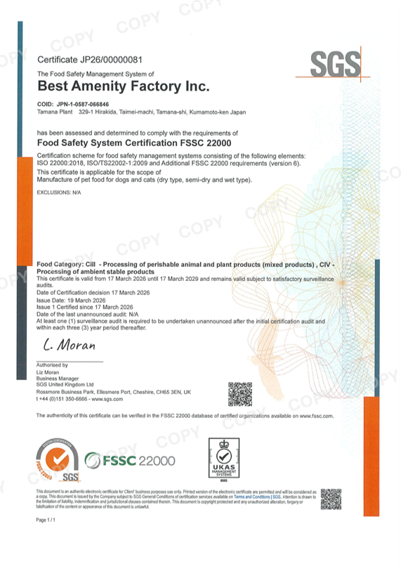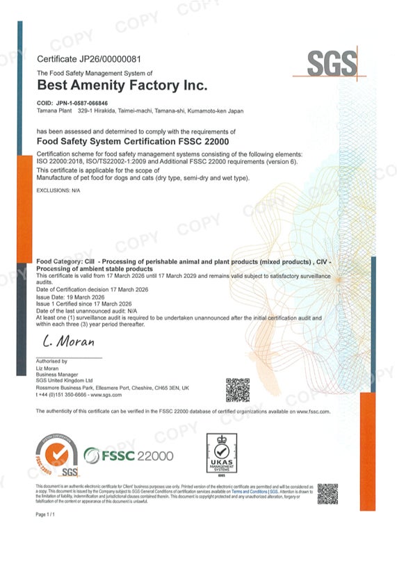 (株)ベストアメニティファクトリー 玉名工場(ペットフード) FSSC22000認証を取得
