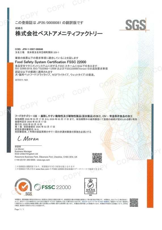 今回の認証取得の対象は、玉名工場における犬・猫用ペットフードの製造に関する工程であり、当社の品質および安全性に対する取り組みが国際的に認められたものと考えております。