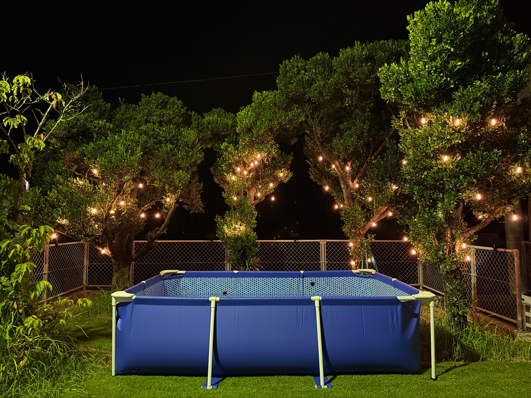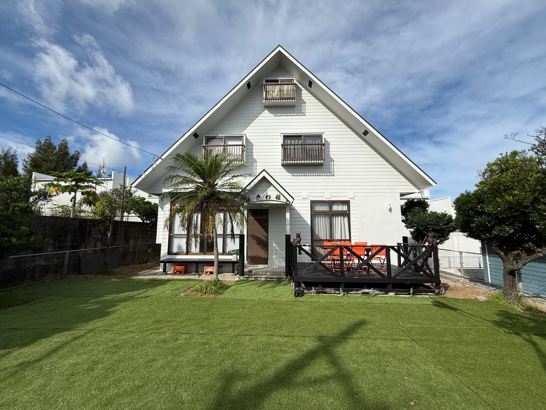 お庭は全面人工芝でウッドデッキでのバーベキュー、ボール遊び、水鉄砲、さらにはプールの設置もございます。恩納村は沖縄の中部あたりに位置するので、ご旅行の拠点にも最適です。