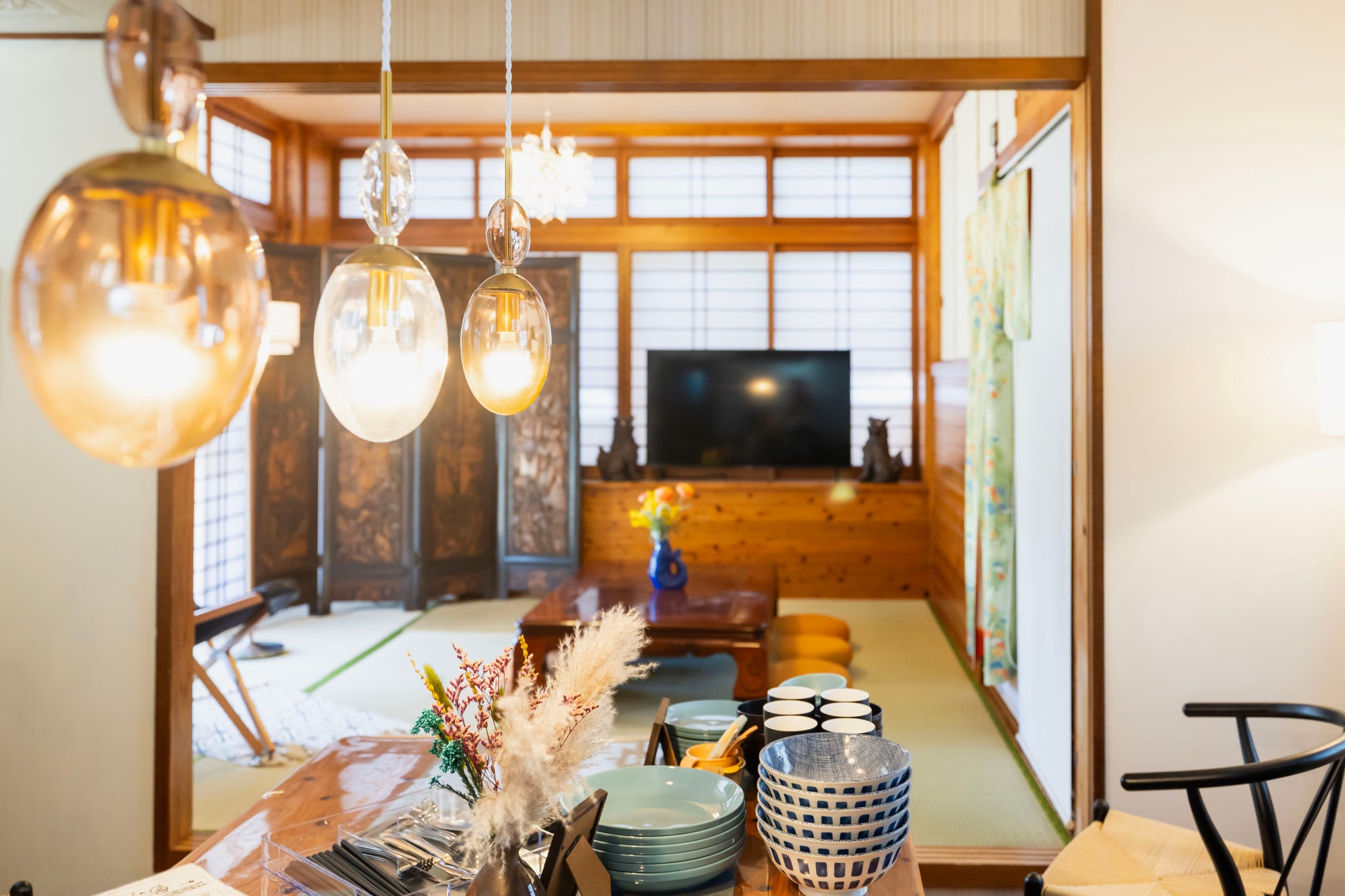 内装は間接照明の灯りが心地よく、温かみのある木材テーブルと黒を基調とした椅子や家電で引き締まりのある大人空間を演出。