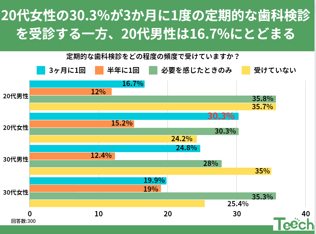定期的な歯科検診をどの程度の頻度で受けていますか?というンケートに10代〜30代の男女が答えました。