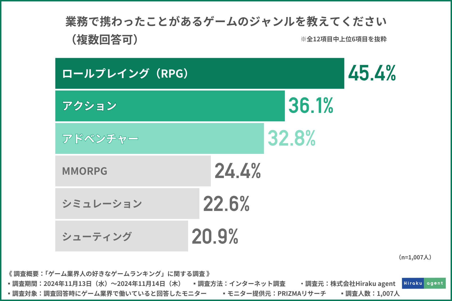 続いて、「業務で携わったことがあるゲームのジャンルを教えてください(複数回答可)」と質問したところ、『ロールプレイング(RPG)(45.4%)』と回答した方が最も多く、次いで『アクション(36.1%)』『アドベンチャー(32.8%)』となりました。