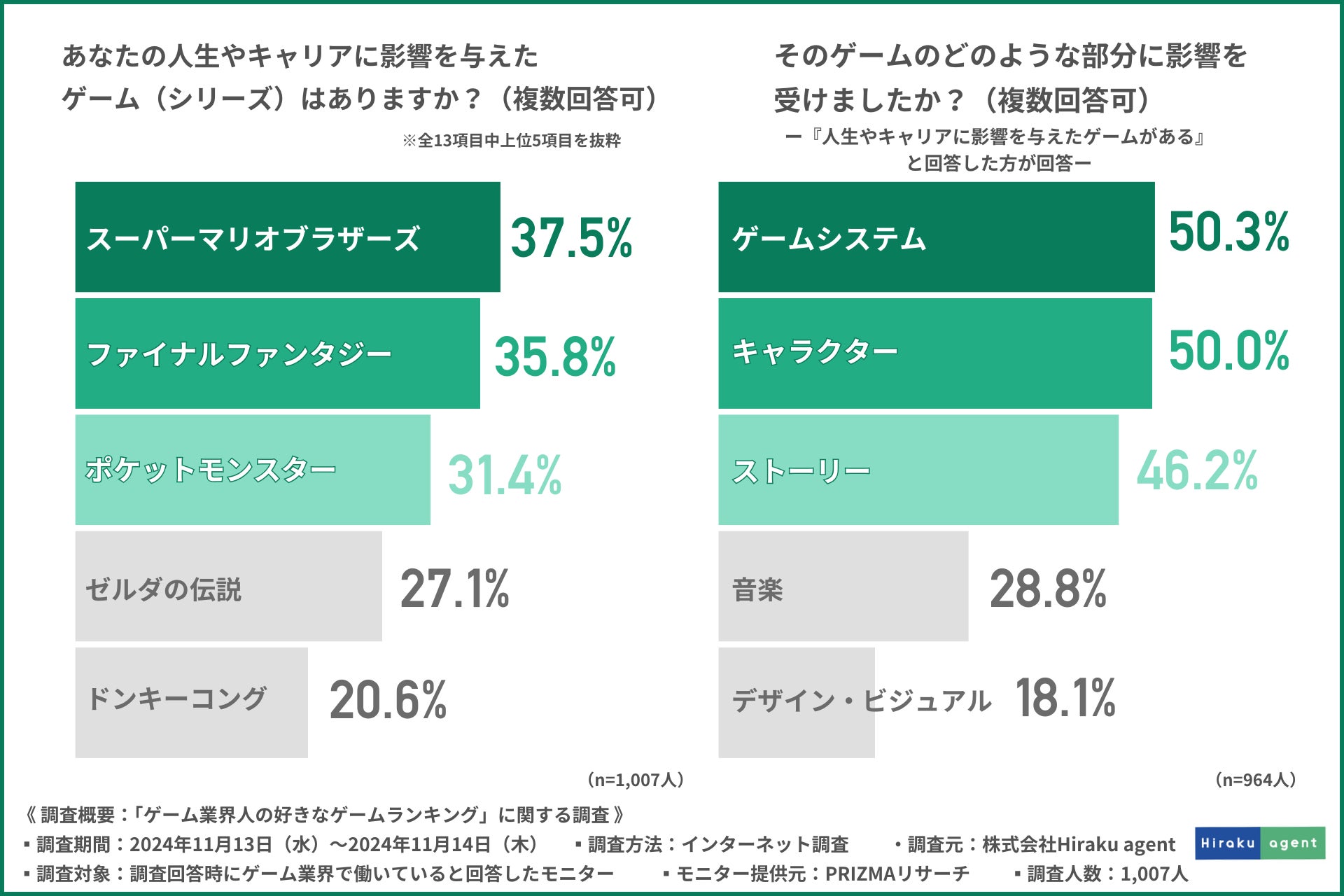 人生やキャリアに影響を与えたゲームは、「スーパーマリオブラザーズ」「ファイナルファンタジー」「ポケットモンスター」などレジェンド的なタイトルが多く挙げられ、ゲームシステムやキャラクター、ストーリーに影響を受けた方が多いことが示されました。