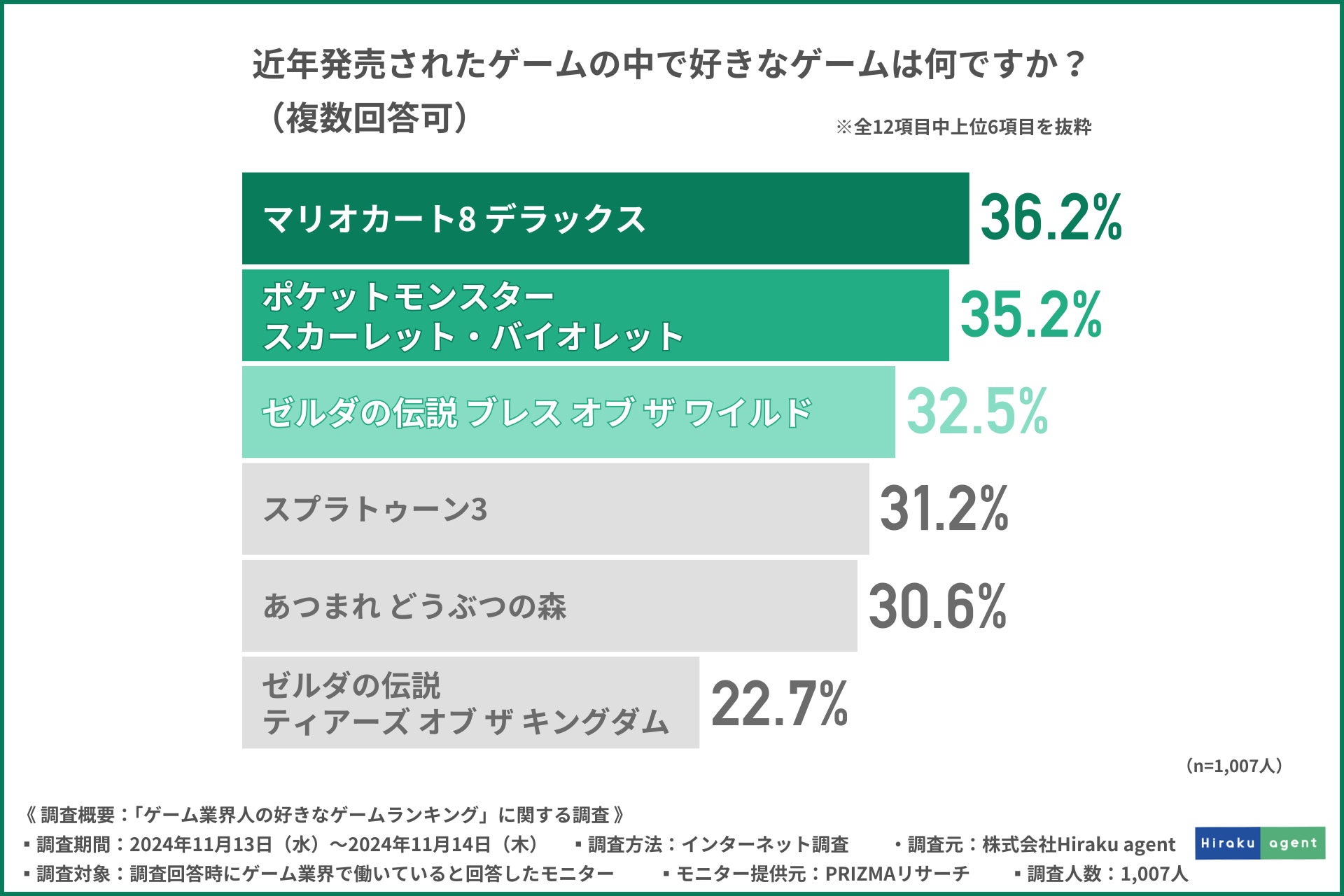 株式会社Hiraku agent(所在地:東京都品川区、代表取締役:加藤 啓介)は、ゲーム業界で働いている方を対象に、「ゲーム業界人の好きなゲームランキング」に関する調査を実施しました。
