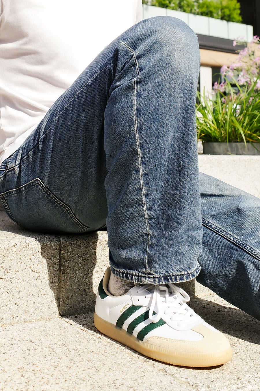 上質なホワイトレザーをベースに、深みのあるカレッジグリーンを採用したメンズモデル。ナチュラルカラーのガムソールとスエードオーバーレイがクラシックな雰囲気を演出。プレミアム感が漂う、ゴールドであしらわれた「SAMBA」の文字がアクセントに。全体的にフレッシュかつヴィンテージ感のあるシックな印象に。