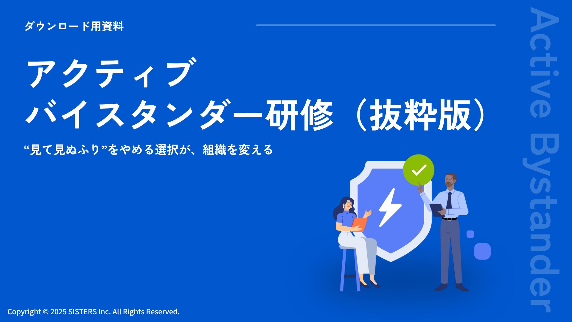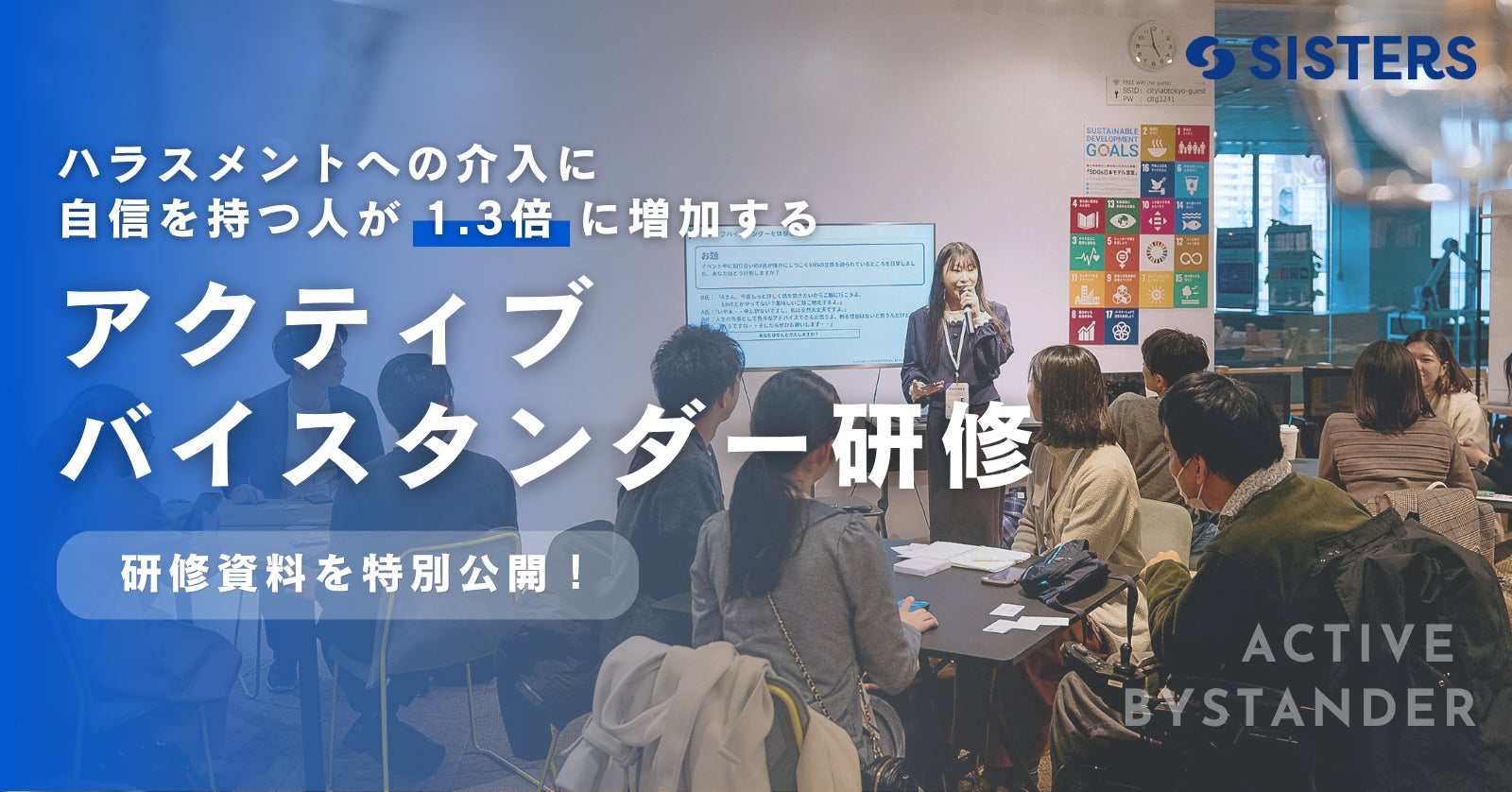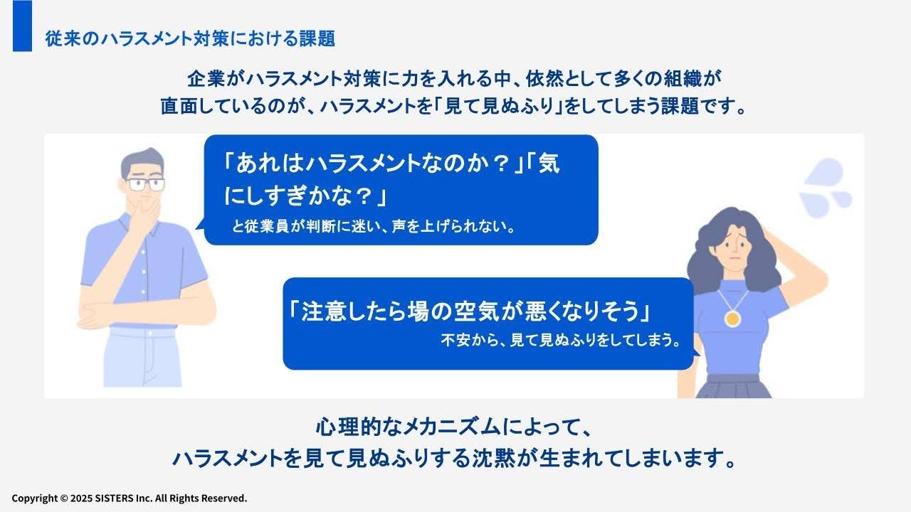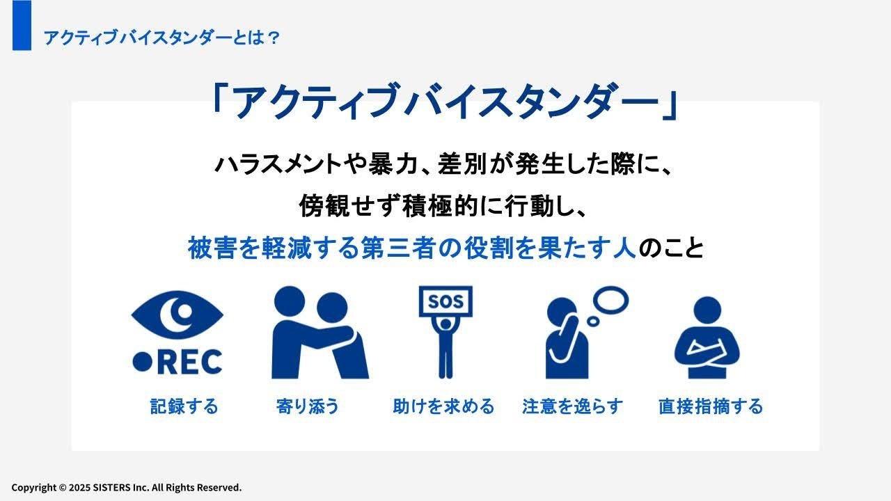 株式会社SISTERS(所在地:東京都新宿区、代表取締役社長: 鈴木彩衣音)は、職場におけるハラスメント防止と対応力向上を目的に、アクティブバイスタンダー研修の提供を行っています。このたび当社では、見て見ぬふりを防ぐ行動を促す一歩として、実際の研修で使用している資料の一部を無料で公開いたしました。これに合わせて、7月30日(水)に特別イベント「注目の“見て見ぬふりをやめる研修”を体感する|人事・組織開発コンプラ担当者のためのアクティブバイスタンダー体験会」も開催いたします。