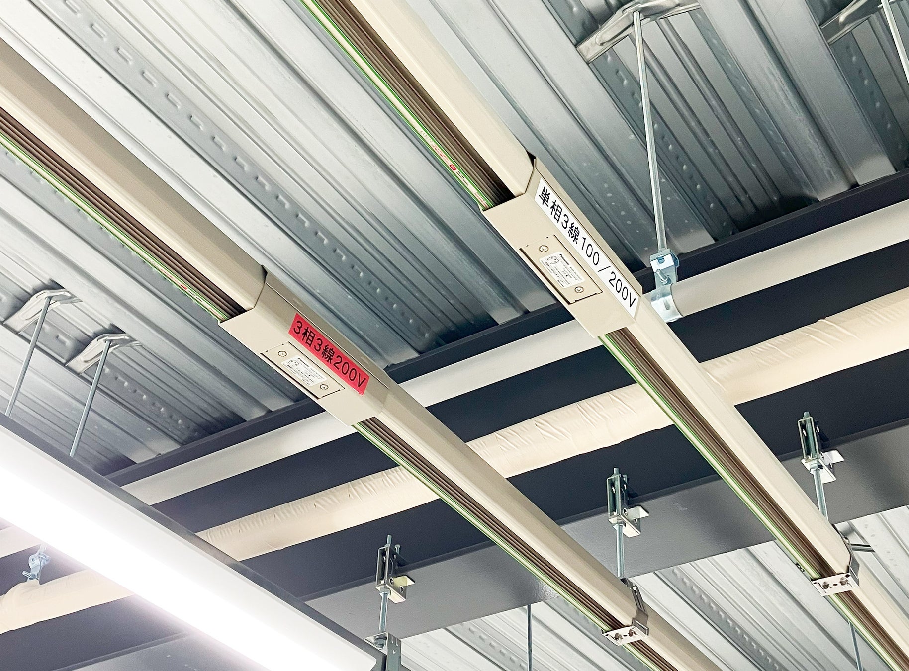 自動梱包ラインの組み立てから動作テストまで行う製造フロアはメーカーの要となる場所です。当社の自動梱包ラインはお客様のご要望によってカスタマイズ設計しているため、大きさや長さは可変します。そこでファクトライン(天井用配線ダクト)を採用し、天井から自由な電源の取り出しを可能としました。生産性・効率性アップとともに、床に張ったコードのひっかかりなどを防止し、従業員のケガ予防、安全性の確保にもなります。