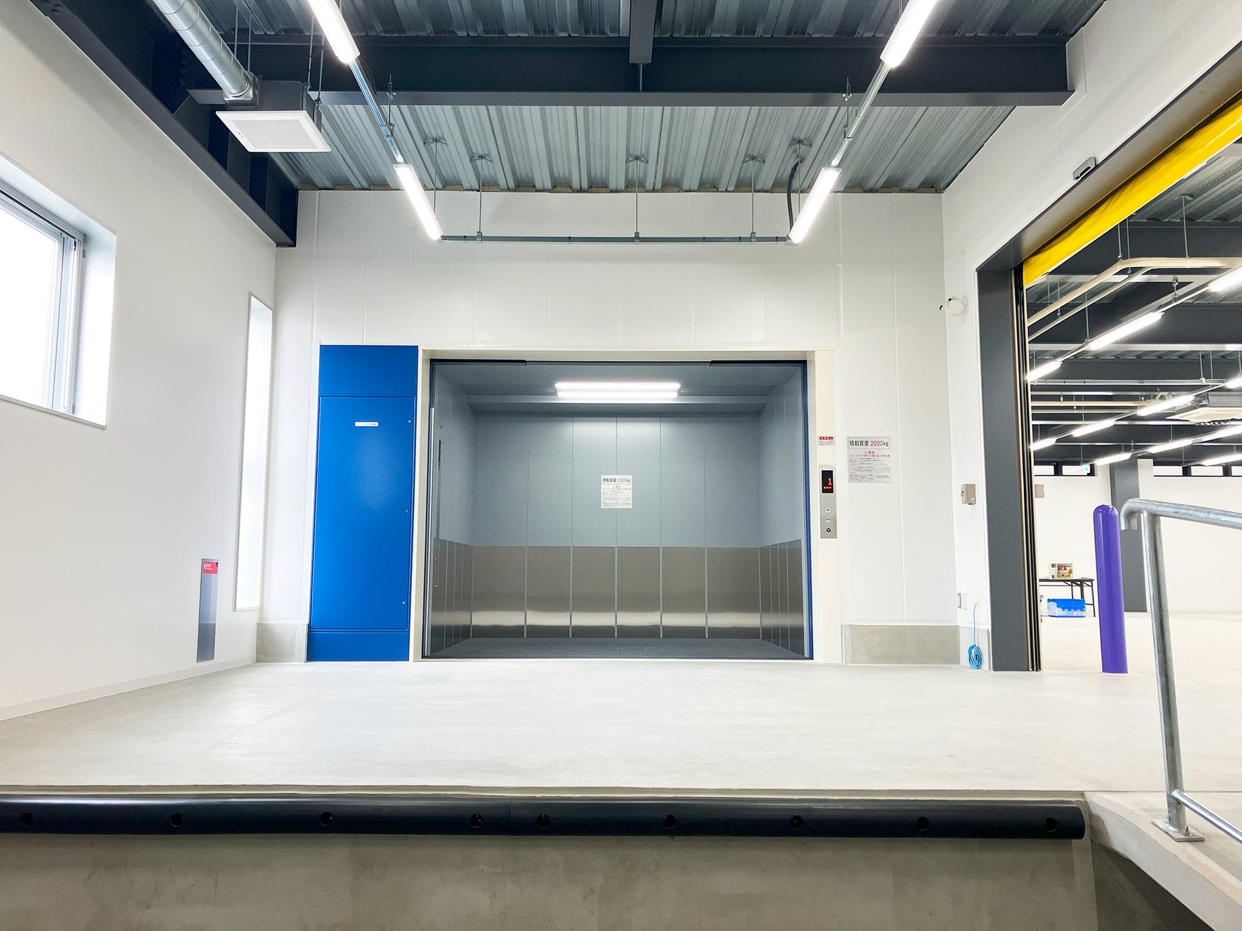 組み立てる機械部品の搬入、そしてお客様へお届けする完成したラインの搬出を行うトラックバース。バースから2階へつながる荷物用エレベーターまでは直線で数メートルしか離れていません。機械の移動に負荷をかけない工夫がされています。
