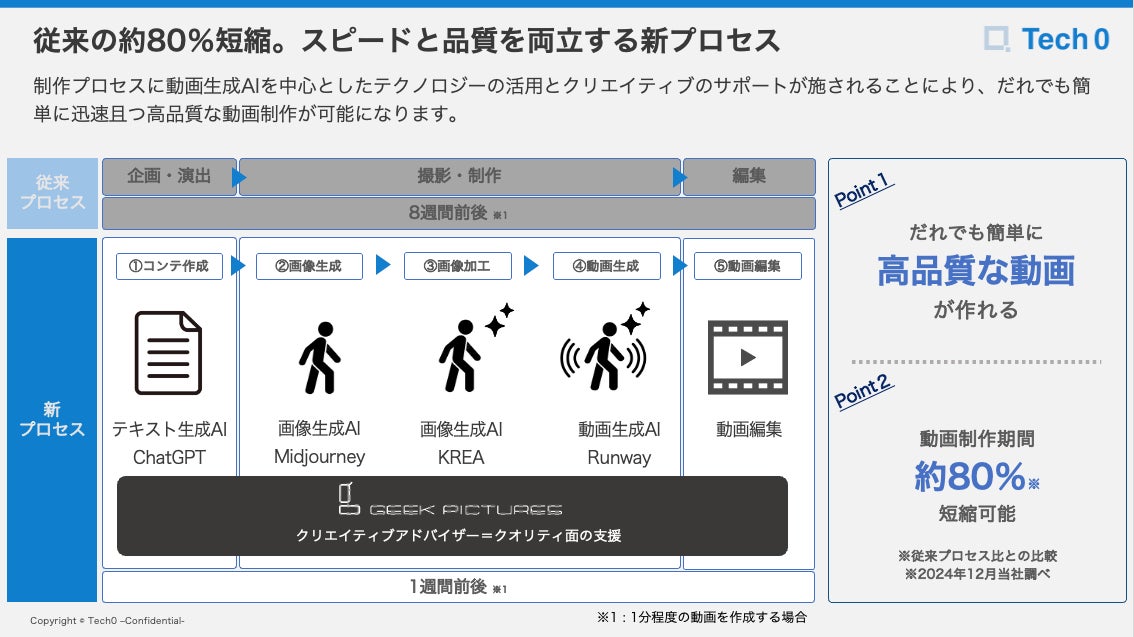 Tech0とギークピクチュアズは、生成AIとプロのクリエイティブ力を融合させることで、動画制作の新たな時代を切り拓き、クリエイティブ業界およびビジネス領域への貢献を目指して取り組んでまいります。
