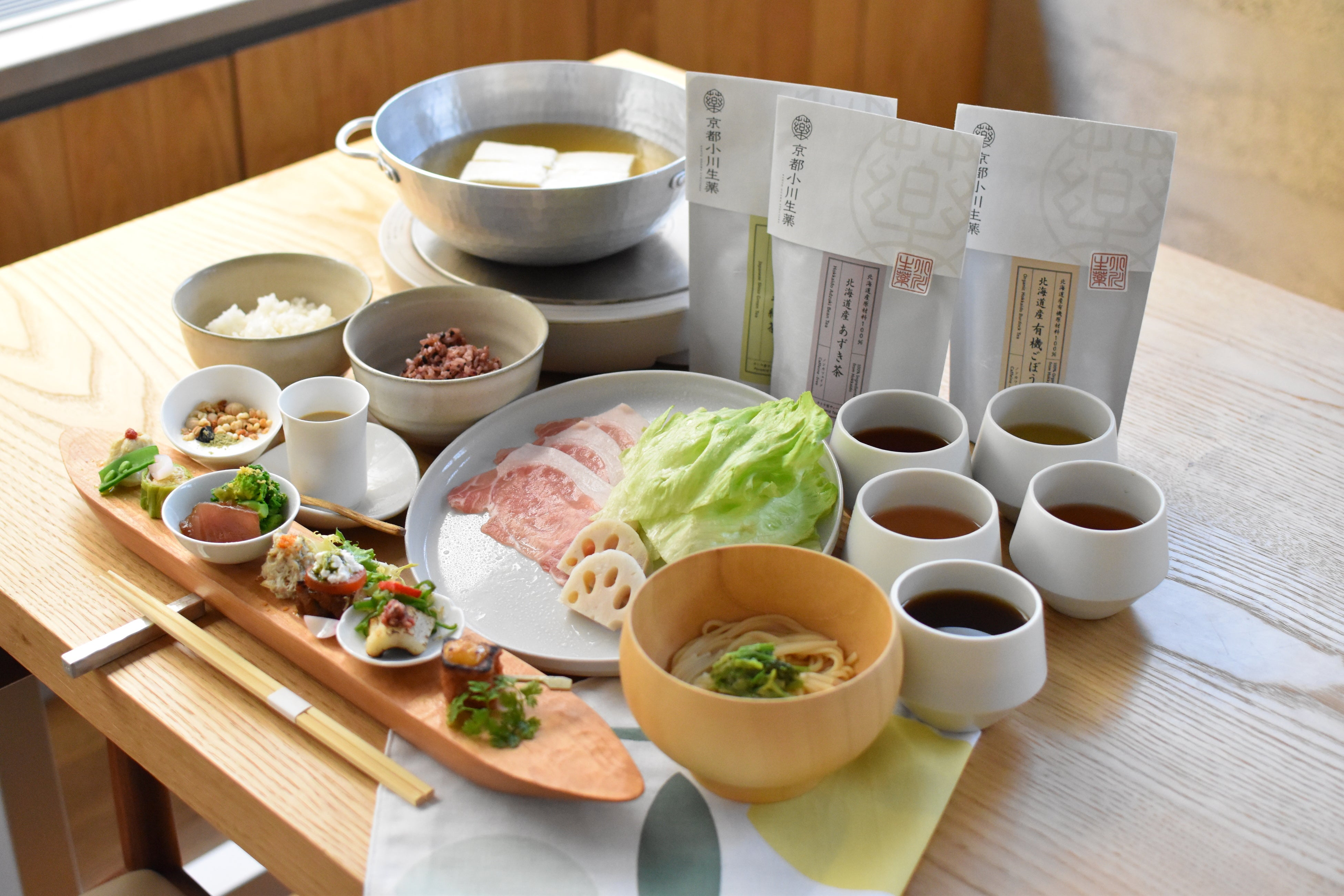 コースには、食 京都小川生薬 レストラン自慢の5種類のお茶が飲み放題で含まれています。食事に合わせてさまざまなお茶をお楽しみいただけます。