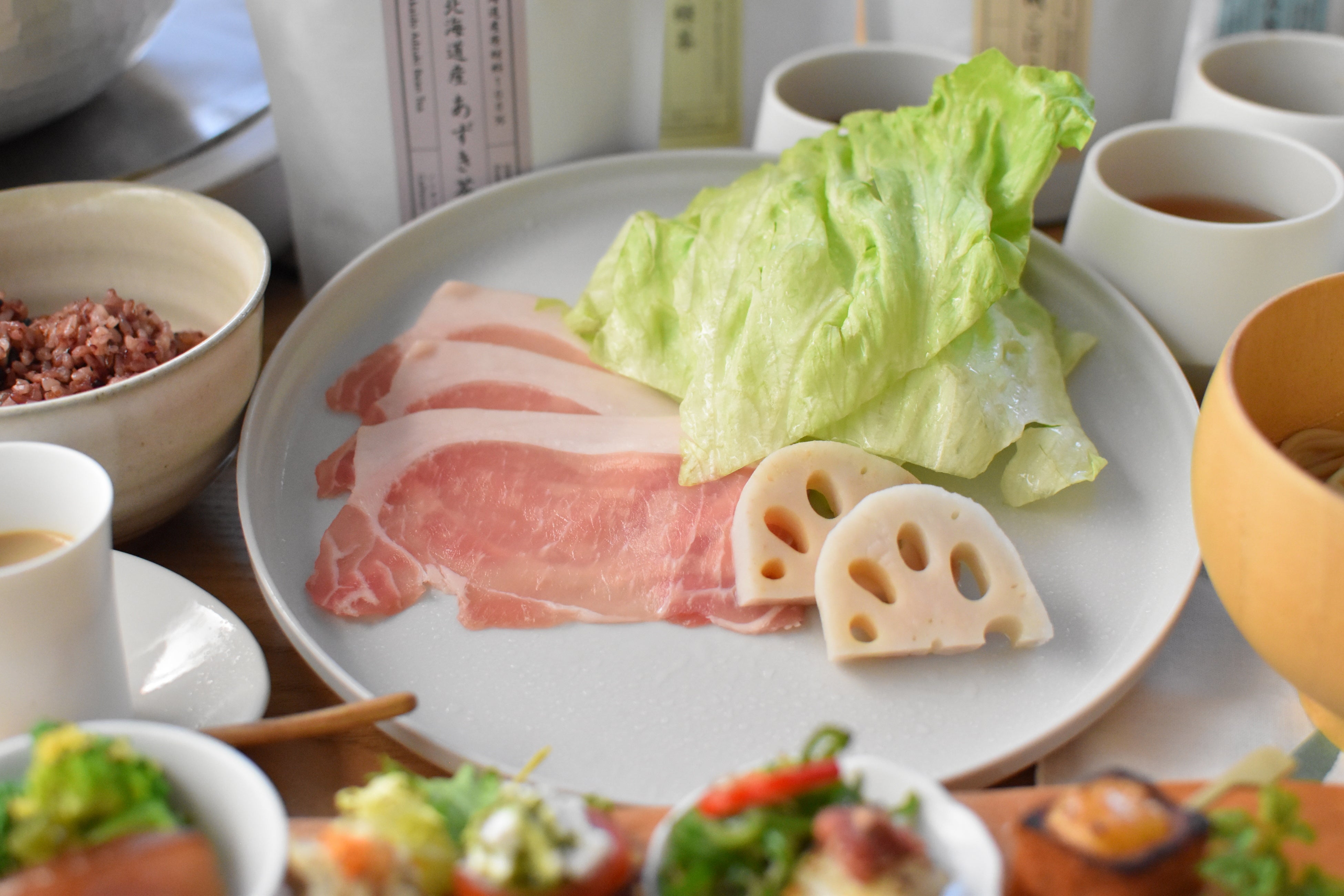 カラダをあたためるお鍋(あぐー豚、京都の絹豆腐、レタス、レンコン) あぐー豚の旨味を引き出したオリジナルのお出汁。京都の絹豆腐の滑らかさと、シャキシャキのレタス、ホクホクのレンコンが相性抜群!