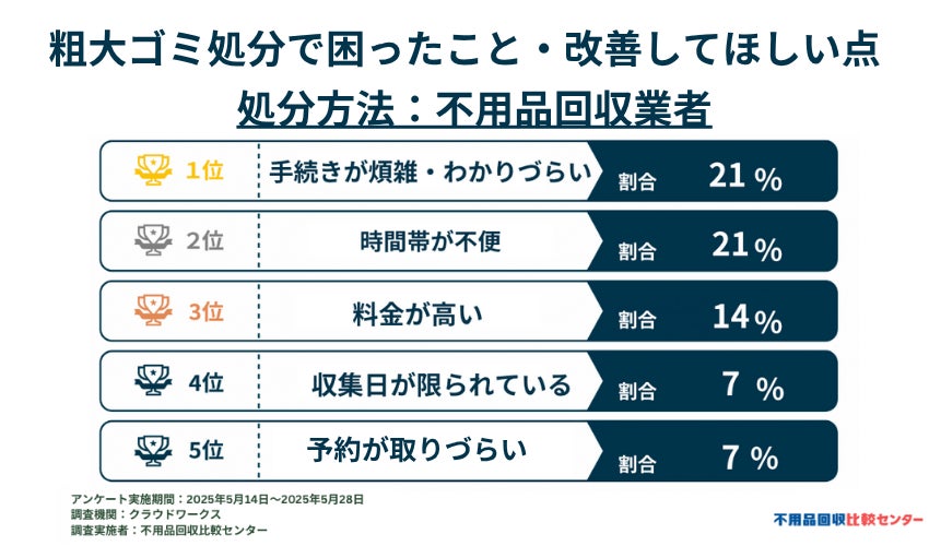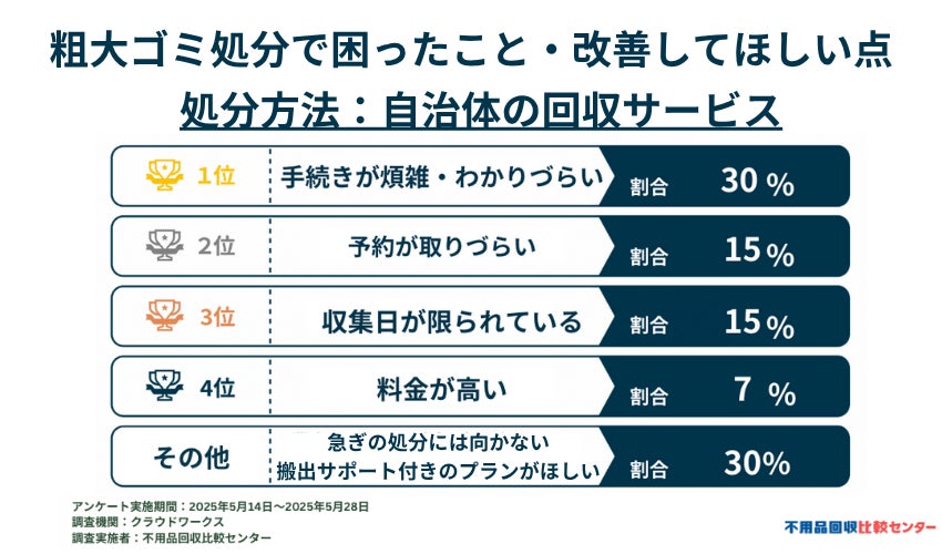 さらに、料金が高い(14%)、収集日が限られている(7%)、予約が取りづらい(7%)といった声も上がっています。