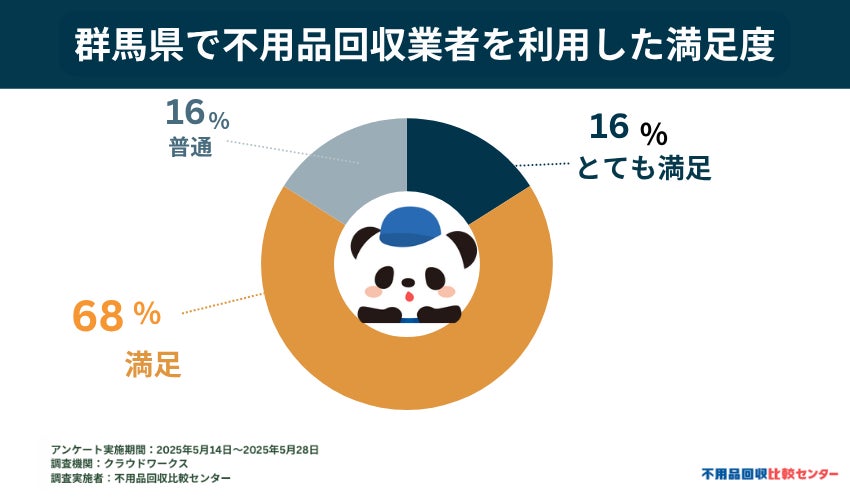 不用品回収業者を利用した群馬県の回答者のうち、68%が「満足」、16%が「とても満足」と回答しており、8割以上が肯定的な評価を示しました。
