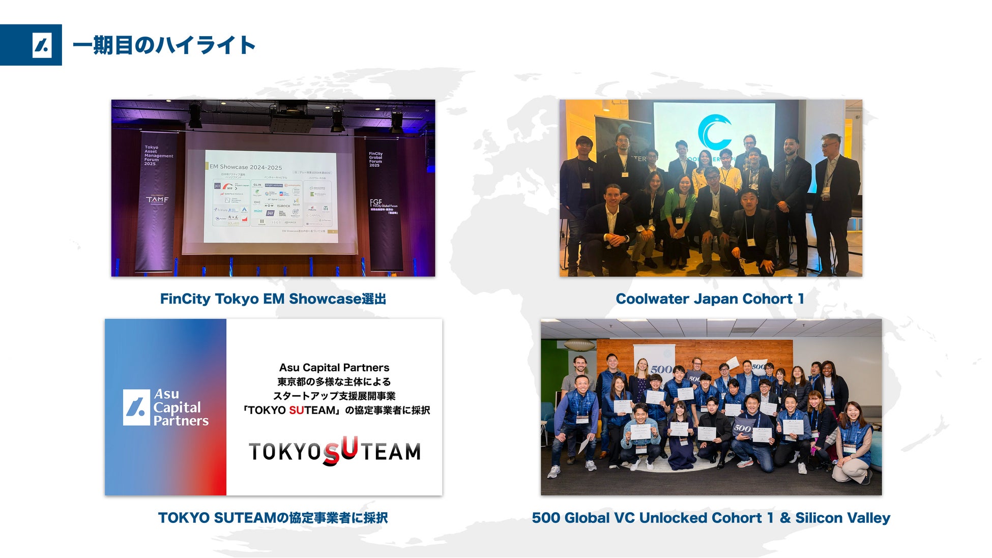 ファーストクローズ以降、支援先に対して海外市場への参入サポートやネットワークアクセス、次回調達のサポート、インキュベーション、インサイト提供を進めながら、ファームとしてもFinCity Tokyo EM Showcaseの選出や東京都のTOKYO SUTEAM協定事業者に採択されています。また、”Japan to Global”という面においても、積極的に支援先を対象としたネットワーク・インサイト提供を海外投資家と連携しながら実施し、海外市場への参入サポートを提供しています。