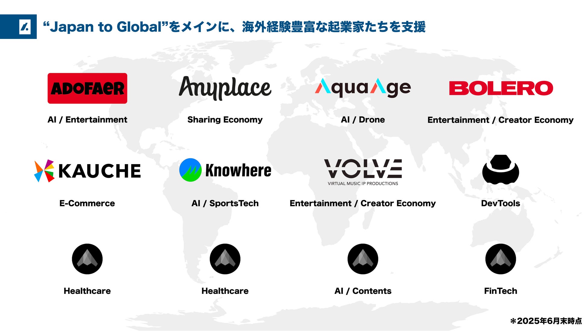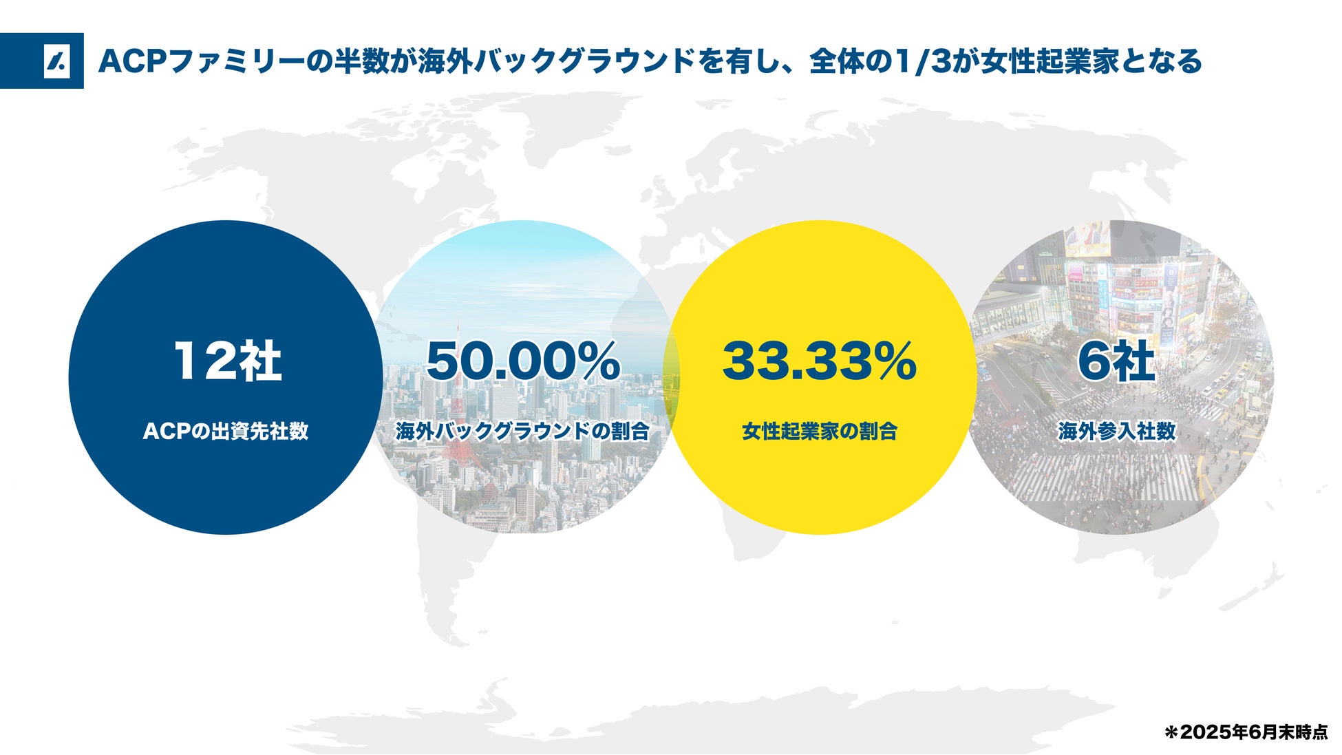 2024年4月、ファーストクローズのリリース以降、累計12社のスタートアップへ出資を行いました。そのうち、すでに半数にあたる6社が海外市場での挑戦をスタートし、海外の大手事業会社との案件獲得に成功したスタートアップも生まれています。ファイナルクローズを経て、ACPは今後さらに、創業出資及び既存出資先の“Japan to Global”の支援体制を強化し、日本発グローバルスタートアップの創出に全力で取り組んでまいります。
